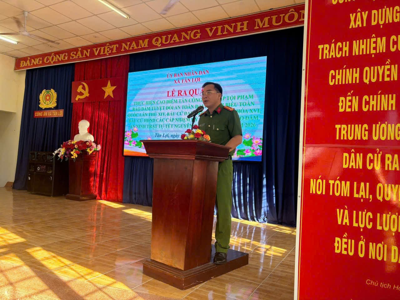 Thực hiện Kế hoạch số 2126/KH-CAT-PC06-PV01 ngày 05/12/2025 của Công an tỉnh Đồng Nai, được sự thống nhất của Đảng ủy - Ủy ban Nhân dân xã, lúc 07 giờ 30 phút ngày 12/12/2025, Công an xã Tân Lợi long trọng tổ chức lễ ra quân thực hiện cao điểm tấn công trấn áp tội phạm, bảo đảm an ninh trật tự đại hội đại biểu toàn quốc lần thứ XIV của Đảng, bầu cử đại biểu Quốc hội khóa XVI và Hội đồng nhân dân các cấp, nhiệm kỳ 2026-2031.