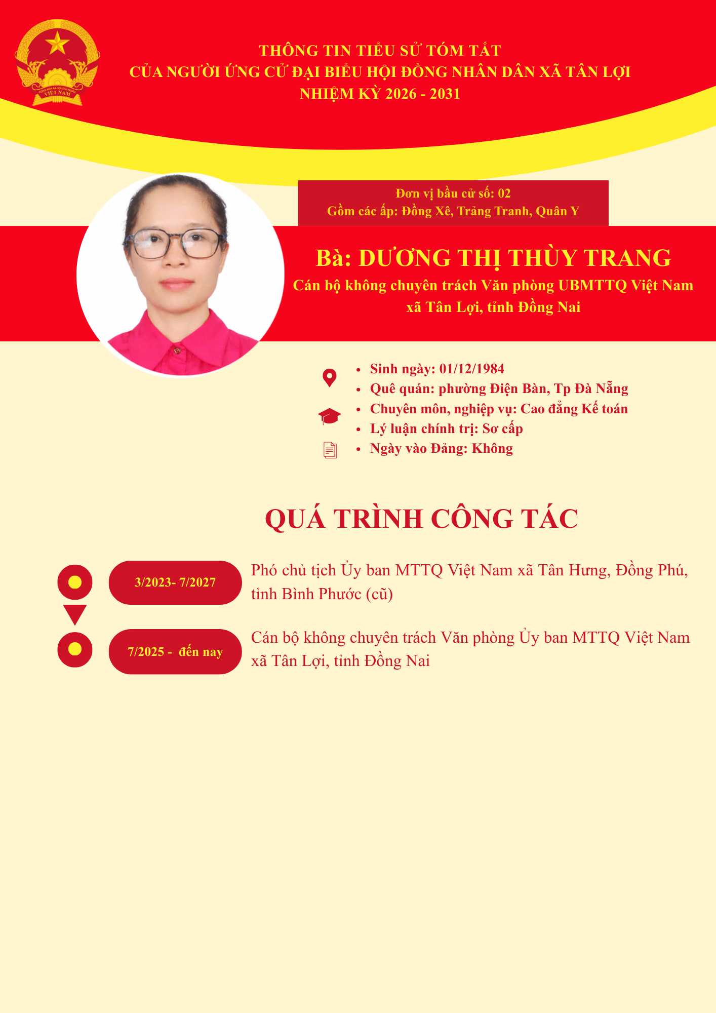 Xã Tân Lợi xin trân trọng giới thiệu tiểu sử ứng cử viên Đại biểu Hội đồng nhân xã Tân Lợi, nhiệm kỳ 2026-2031: Bà Dương Thị Thùy Trang