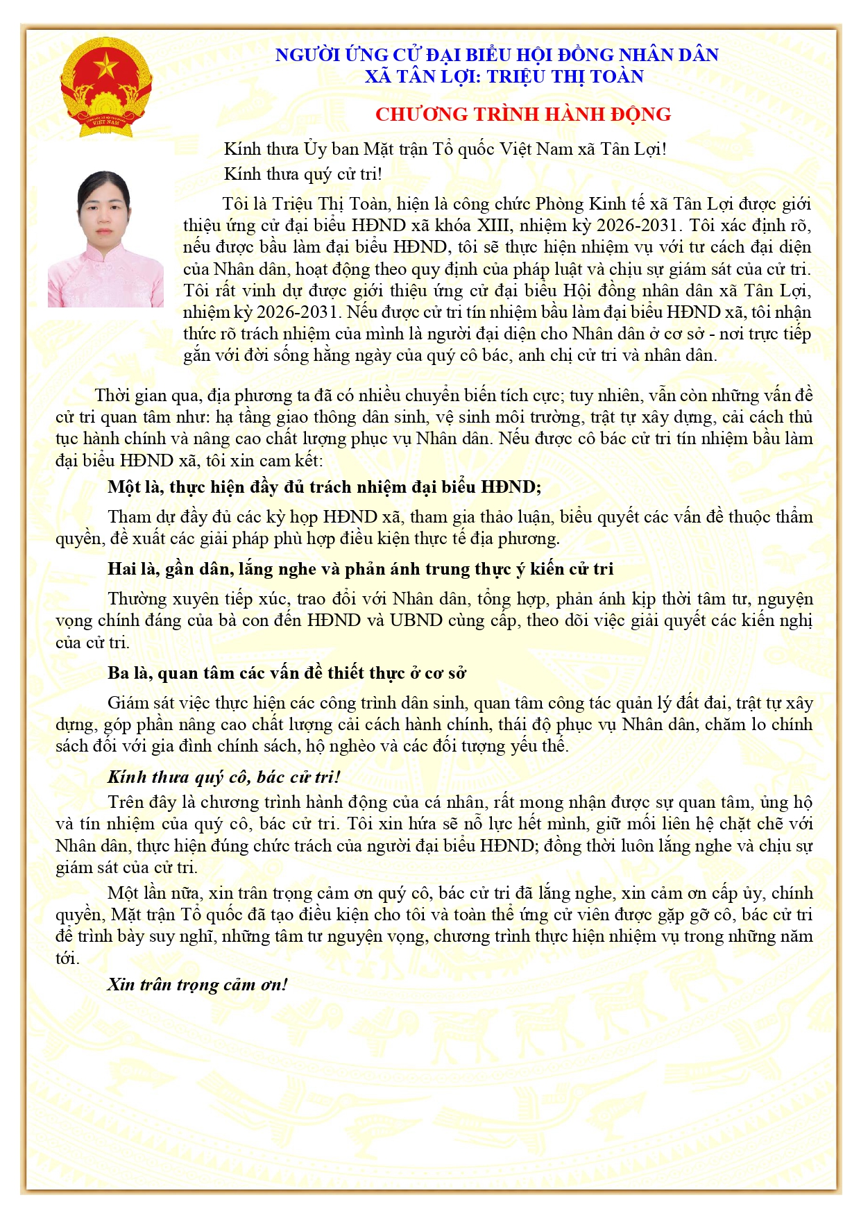 Xã Tân Lợi xin trân trọng giới thiệu tiểu sử tóm tắt và chương trình hành động ứng cử viên Đại biểu Hội đồng nhân xã Tân Lợi, nhiệm kỳ 2026-2031: Bà Triệu Thị Toàn