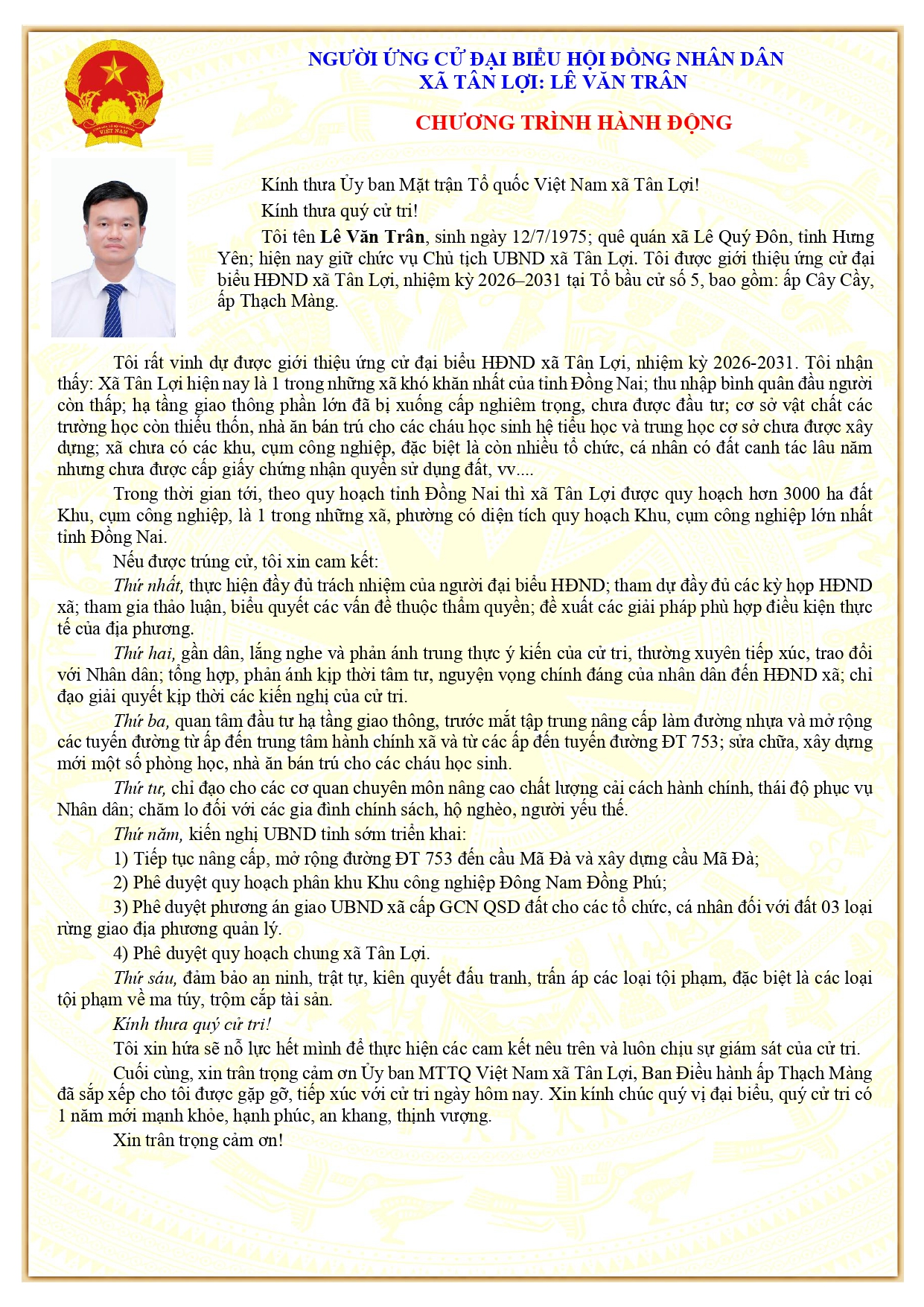 Tiểu sử tóm tắt và chương trình hành động người ứng cử Đại biểu HĐND xã Tân Lợi nhiệm kỳ 2026-2031: Ông Lê Văn Trân