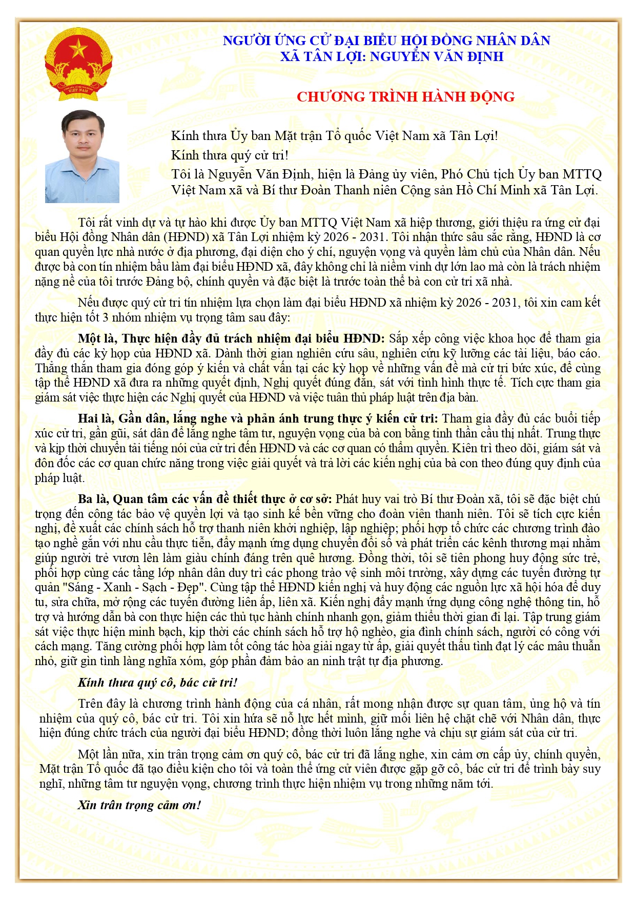 Tiểu sử tóm tắt và chương trình hành động người ứng cử Đại biểu HĐND xã Tân Lợi nhiệm kỳ 2026-2031: Ông Nguyễn Văn Định