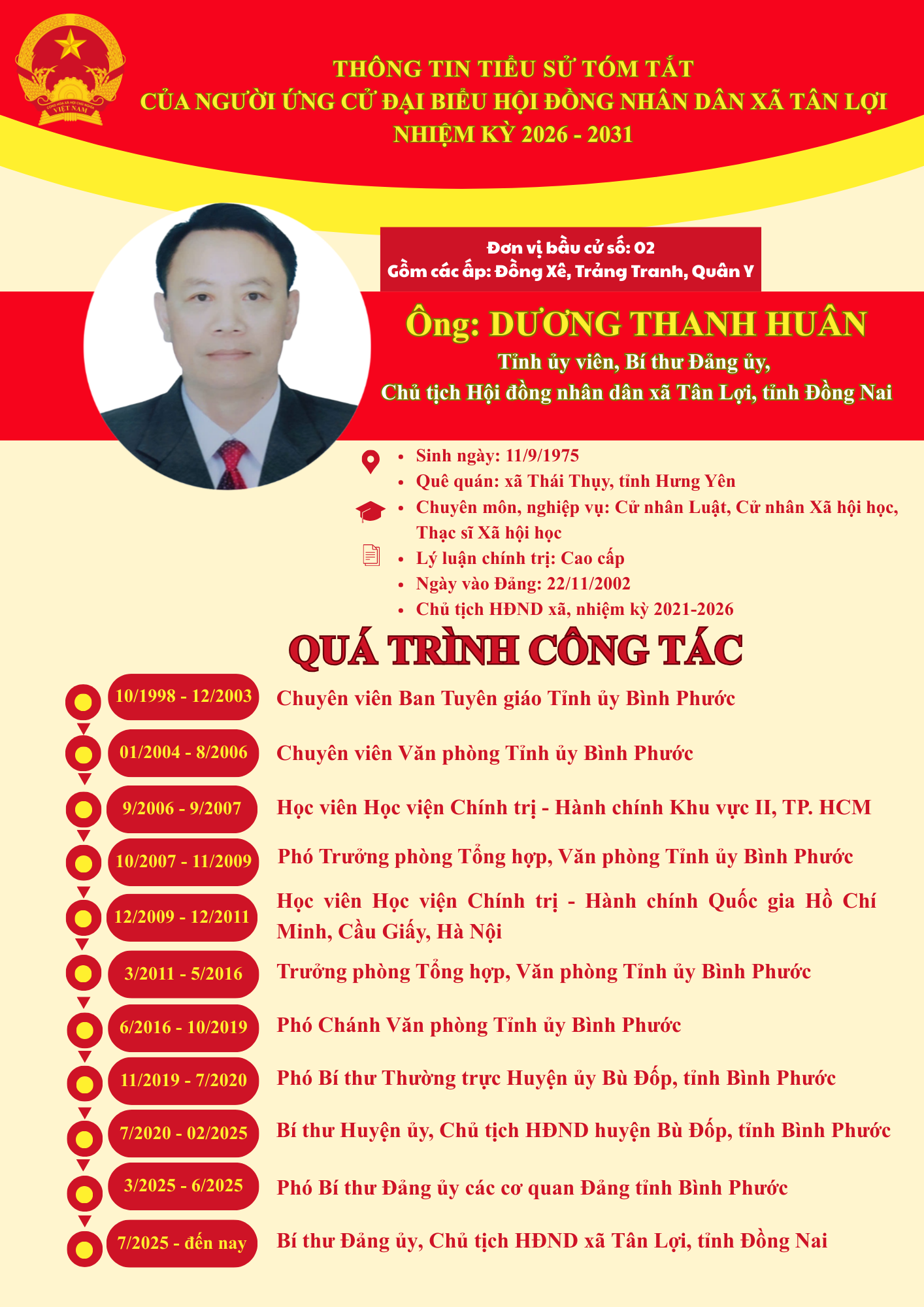 Tiểu sử tóm tắt và Chương trình hành động của đồng chí Dương Thanh Huân – Tỉnh ủy viên, Bí thư Đảng ủy, Chủ tịch Hội đồng nhân dân xã Tân Lợi, tỉnh Đồng Nai; ứng cử viên đại biểu HĐND xã Tân Lợi, nhiệm kỳ 2026-2031