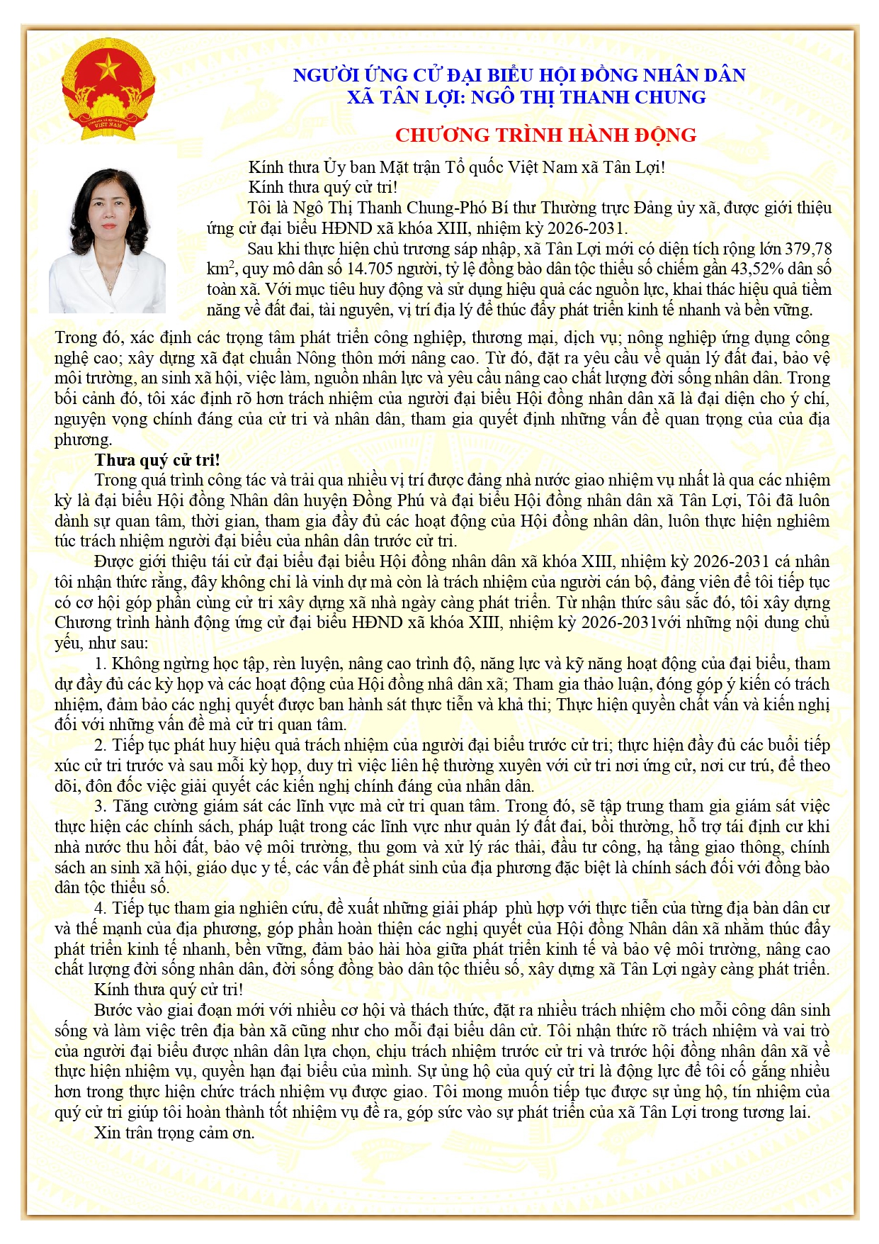 TIỂU SỬ TÓM TẮT VÀ CHƯƠNG TRÌNH HÀNH ĐỘNG CỦA CÁC ĐỒNG CHÍ THƯỜNG TRỰC ĐẢNG ỦY XÃ THAM GIA ỨNG CỬ ĐẠI BIỂU HĐND XÃ TÂN LỢI NHIỆM KỲ 2026 - 2031