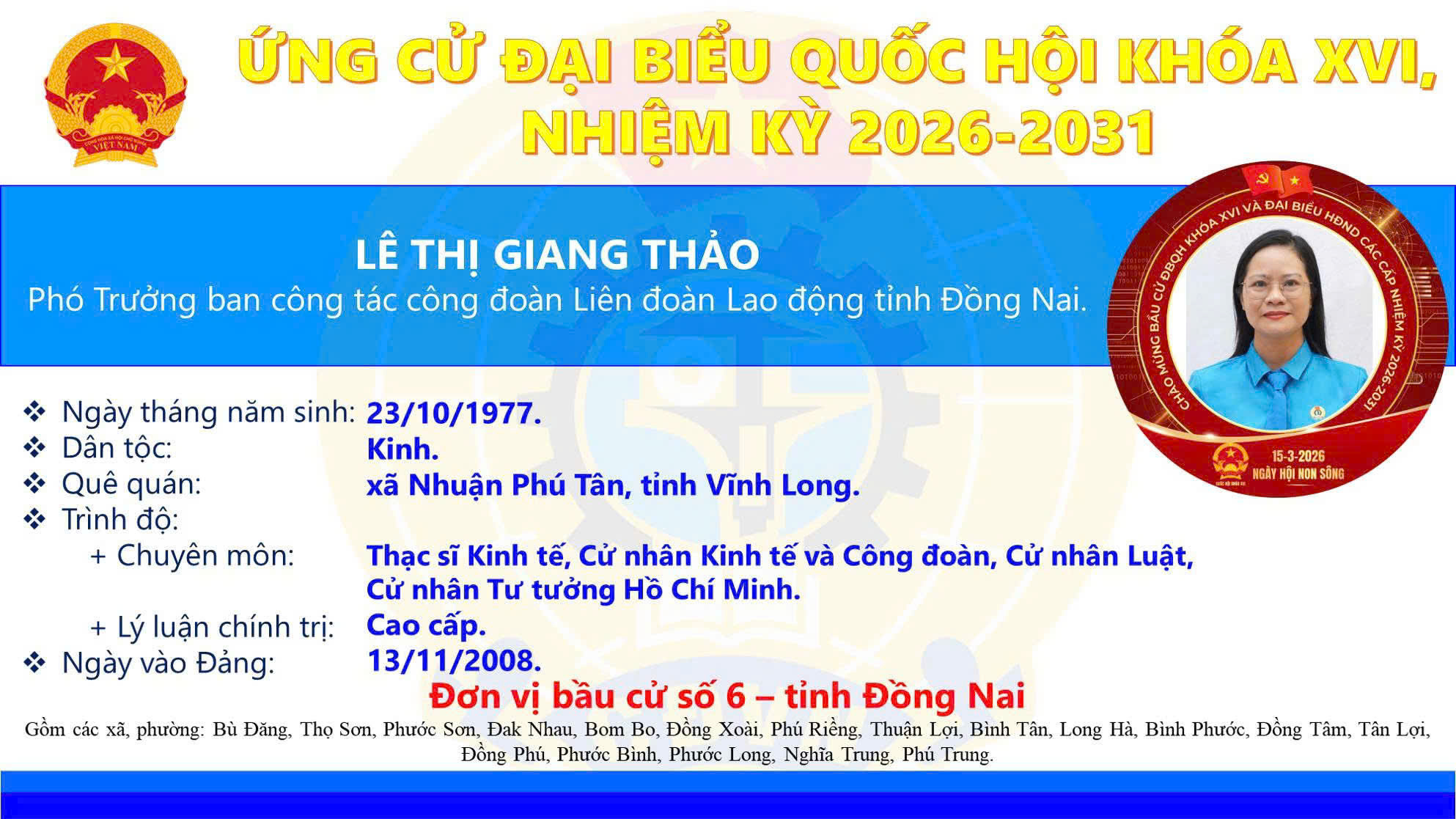 Xin trân trọng giới thiệu tiểu sử tóm tắt và Chương trình hành động của người ứng cử đại biểu Quốc hội khóa XVI tại Đồng Nai - Lê Thị Giang Thảo, Phó ban Công tác Công đoàn, Liên đoàn Lao động tỉnh Đồng Nai.