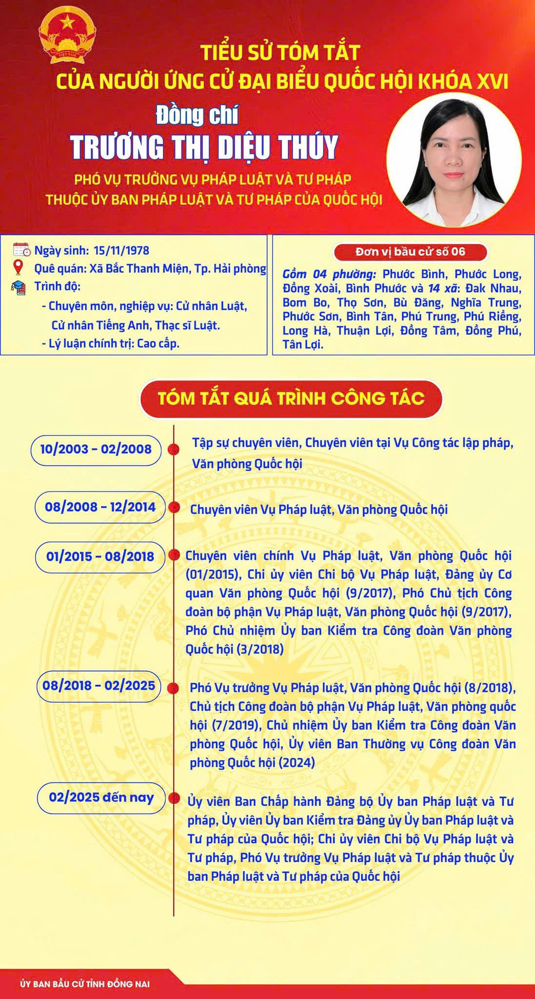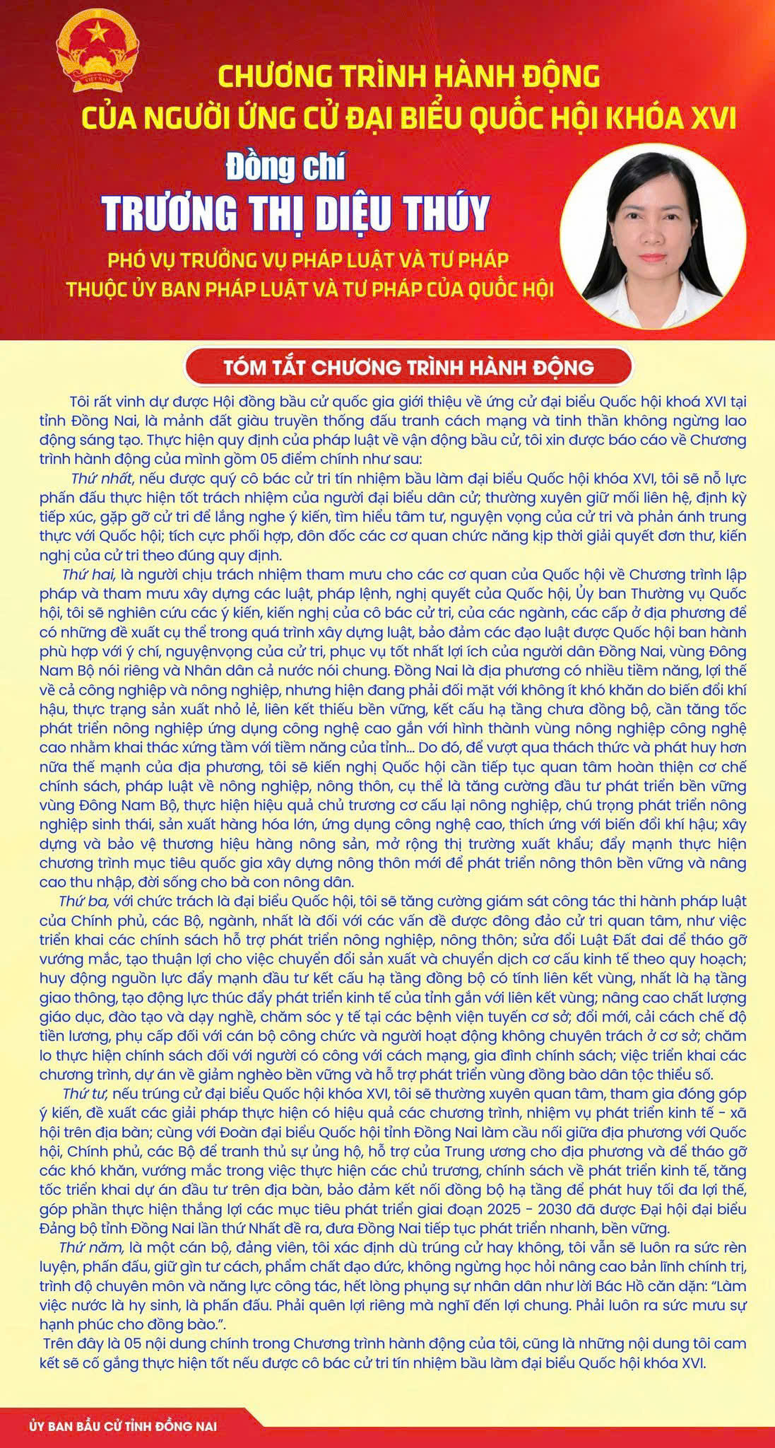 Xin trân trọng giới thiệu tiểu sử tóm tắt và Chương trình hành động của người ứng cử đại biểu Quốc hội khóa XVI tại Đồng Nai - Trương Thị Diệu Thúy, Ủy viên Ban Chấp hành Đảng bộ, Ủy viên Ủy ban Kiểm tra Đảng ủy Ủy ban Pháp luật và Tư pháp, Chi ủy viên Chi bộ Vụ Pháp luật và Tư pháp; Phó Vụ trưởng Vụ Pháp luật và Tư pháp thuộc Ủy ban Pháp luật và Tư pháp của Quốc hội.