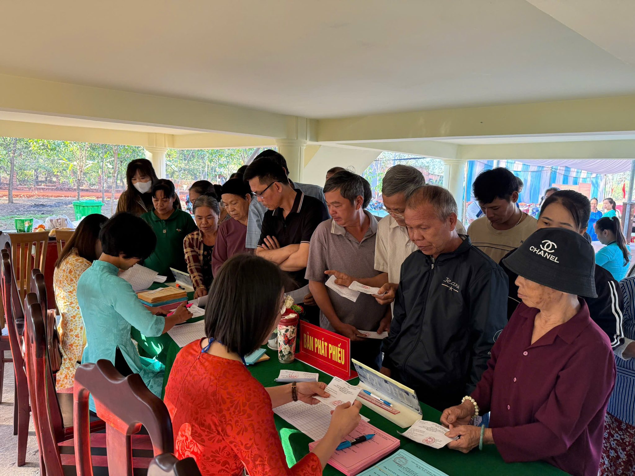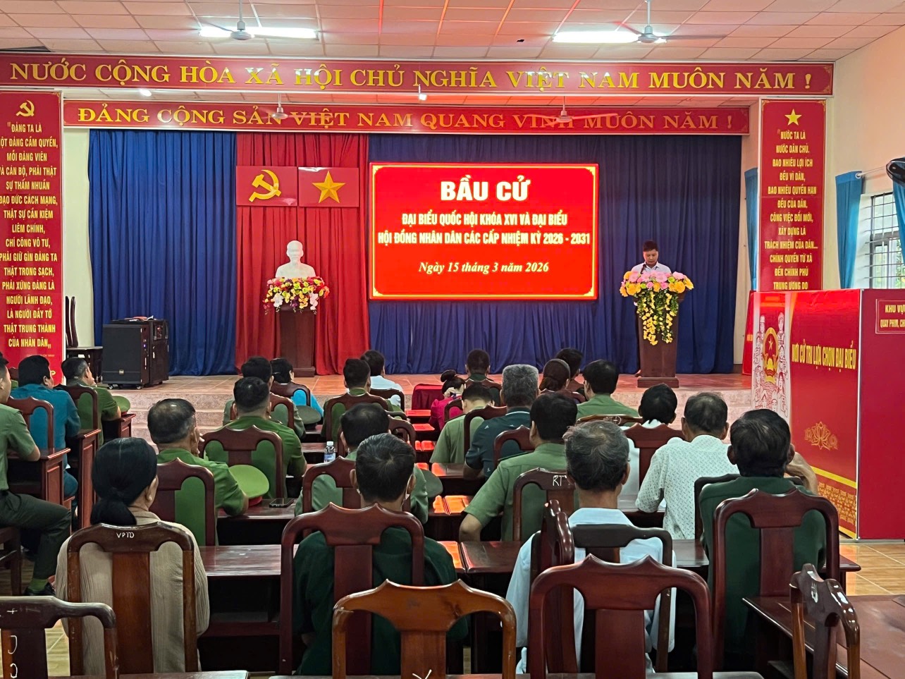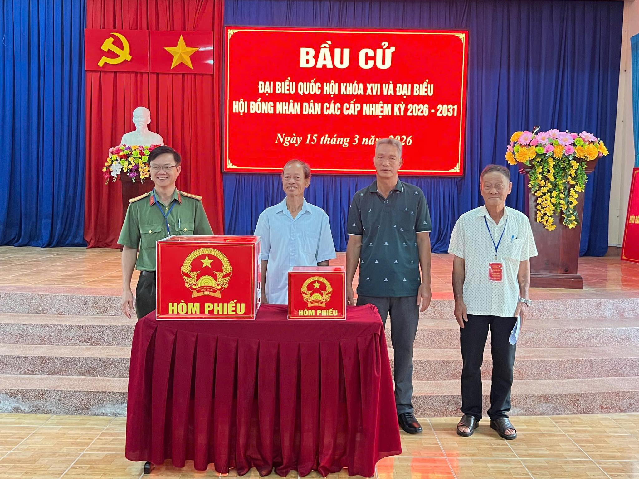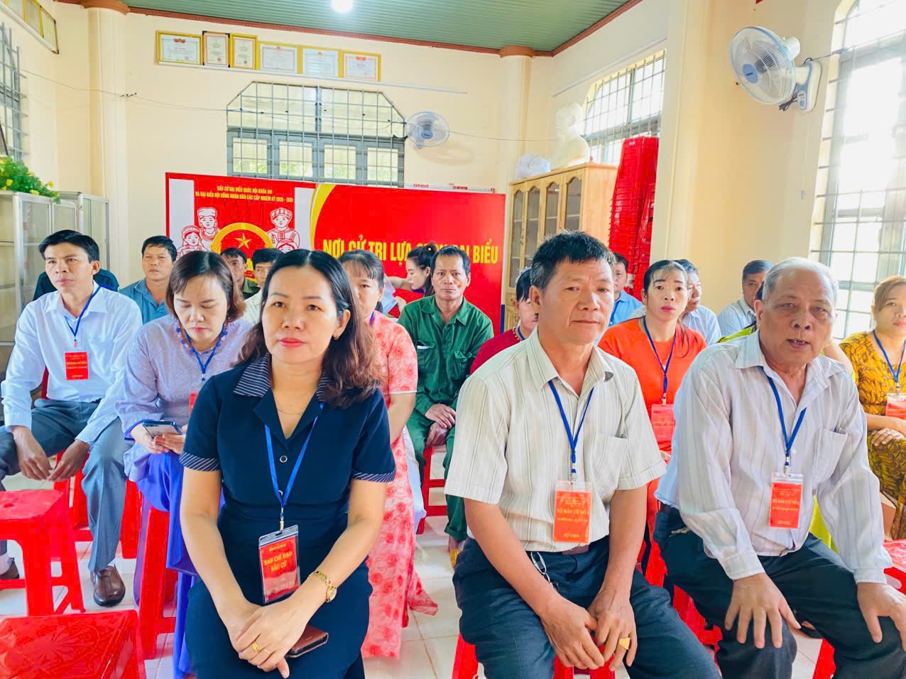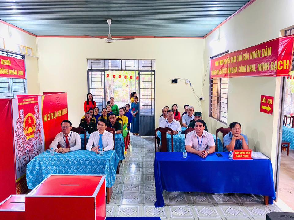 Ngay từ sáng sớm, tại các khu vực bỏ phiếu trên địa bàn xã, cờ Tổ quốc, băng rôn, khẩu hiệu được trang trí trang trọng, tạo nên không khí rộn ràng, phấn khởi. Đông đảo cử tri trong xã đã đến các điểm bỏ phiếu từ rất sớm để thực hiện quyền và nghĩa vụ công dân của mình.
