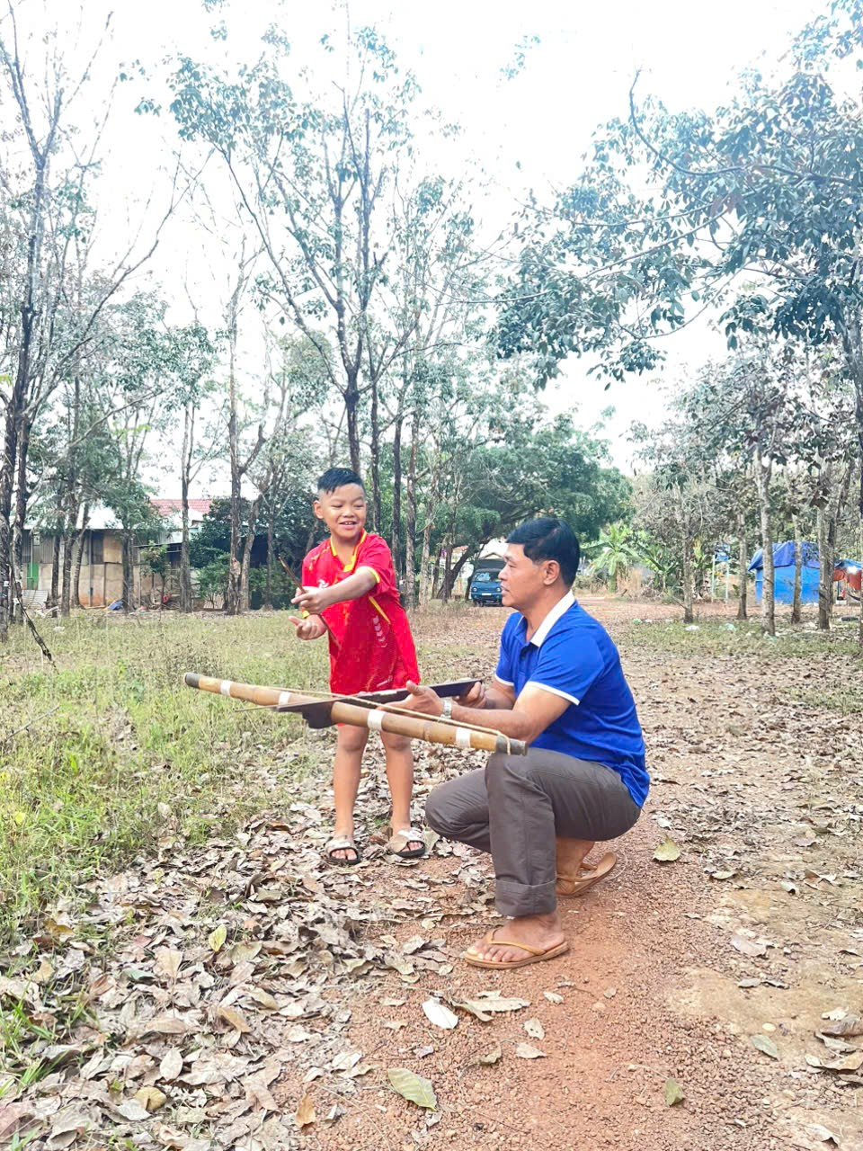 Anh Bùi Văn Miệt hướng dẫn con môn thể thao truyền thống.