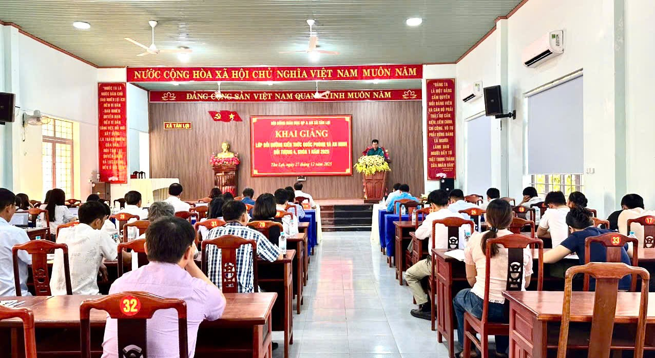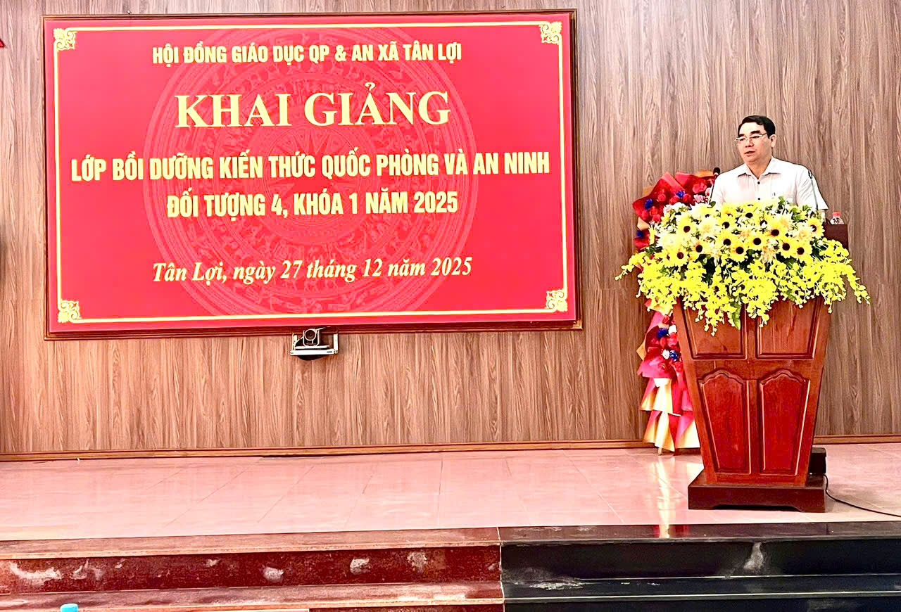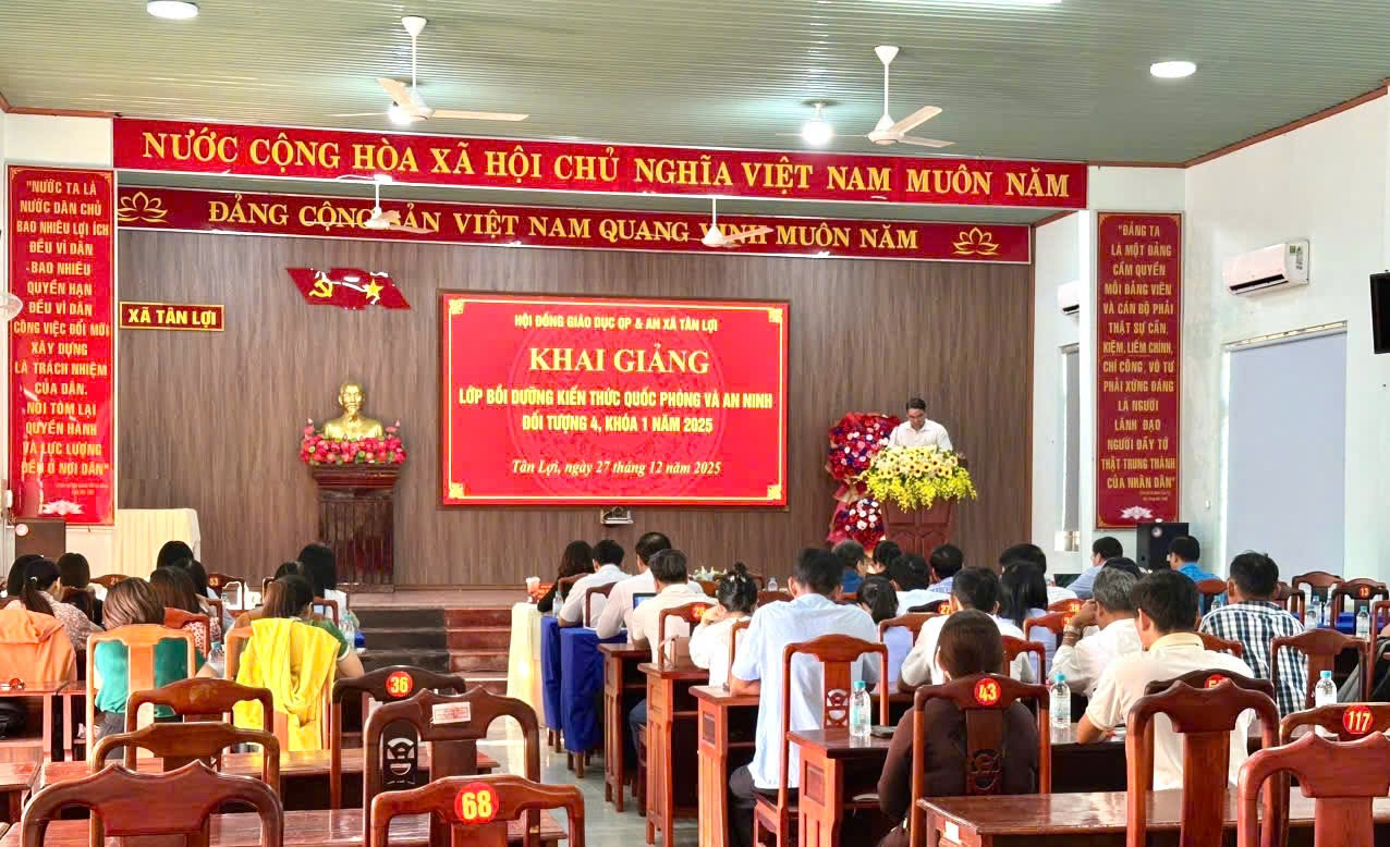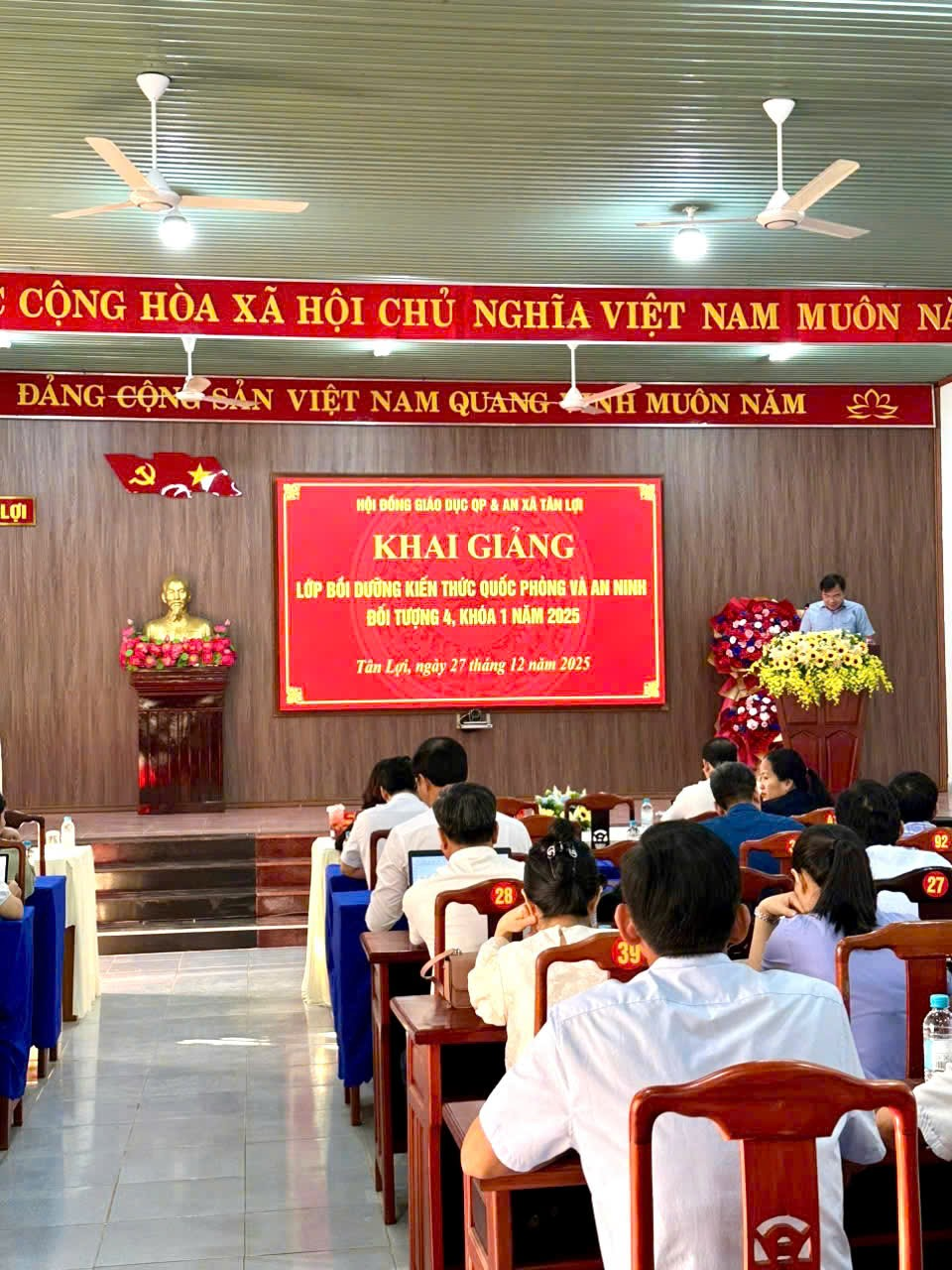 Thực hiện kế hoạch bồi dưỡng kiến thức quốc phòng và an ninh năm 2025, sáng ngày 27/12/2025, tại Hội trường A - UBND xã Tân Lợi, Hội đồng Giáo dục quốc phòng và an ninh xã Tân Lợi đã long trọng tổ chức Lễ khai giảng lớp bồi dưỡng kiến thức quốc phòng và an ninh đối tượng 4, Khóa 1 năm 2025.