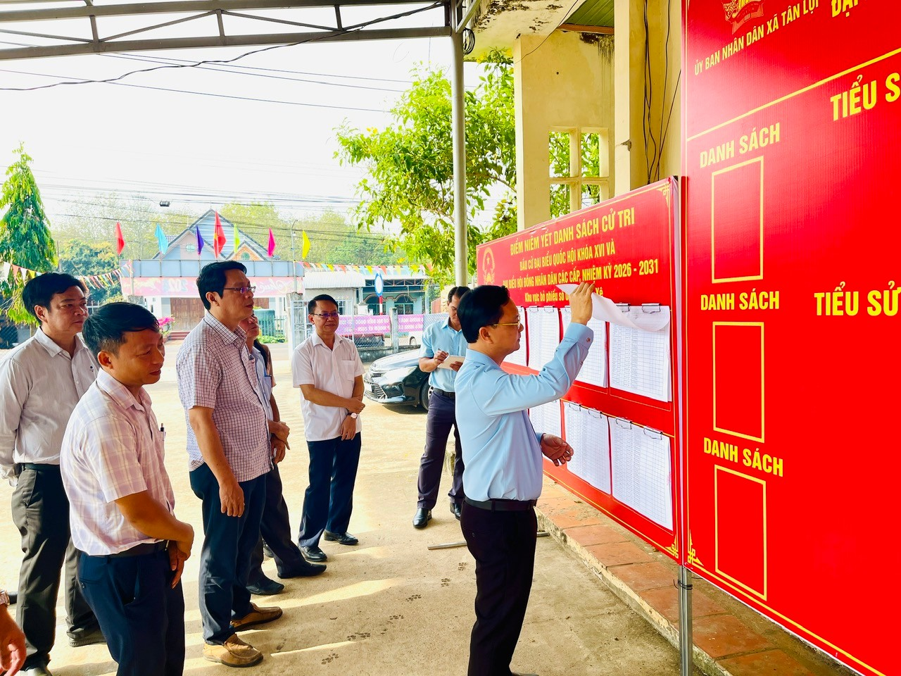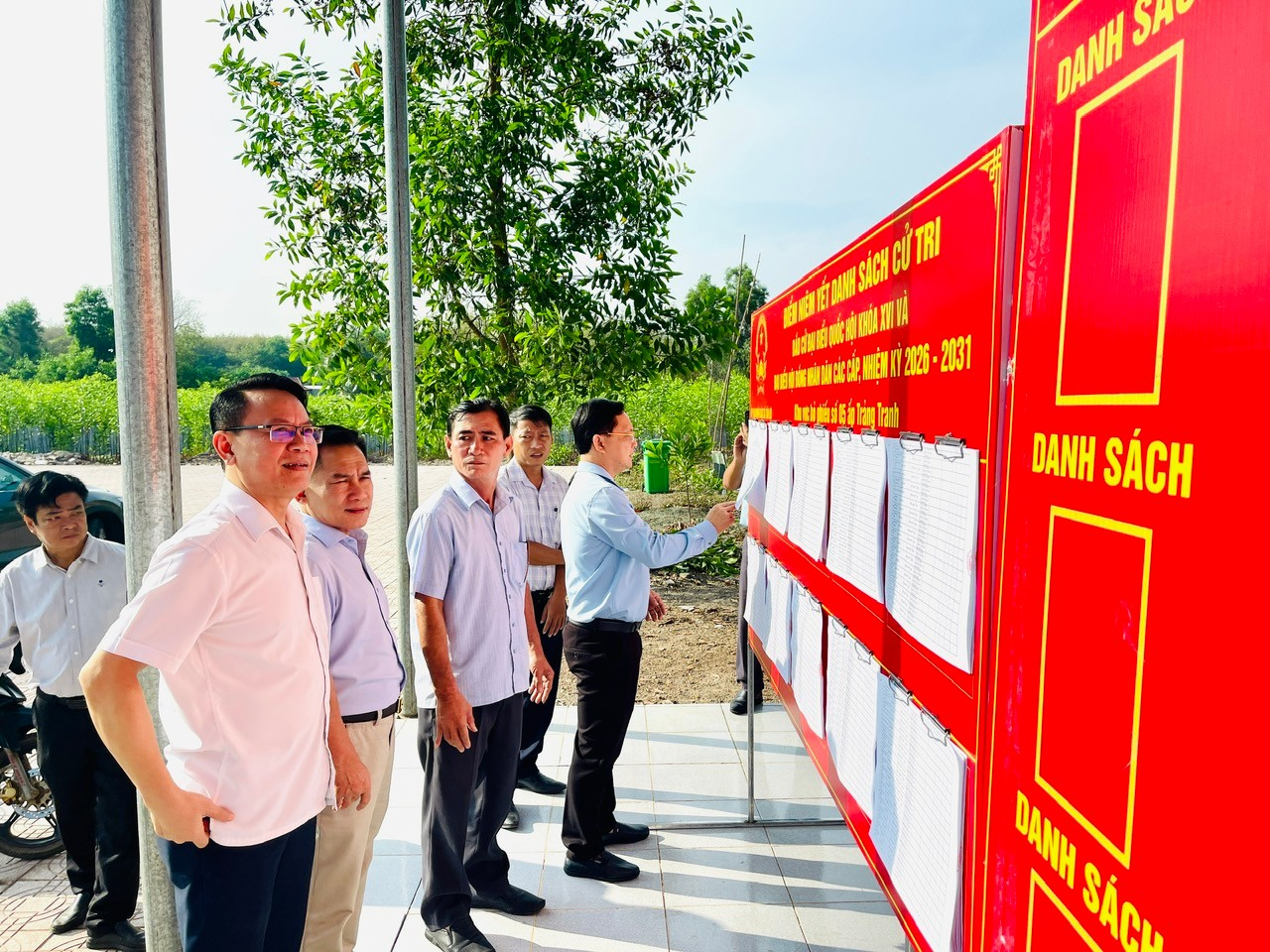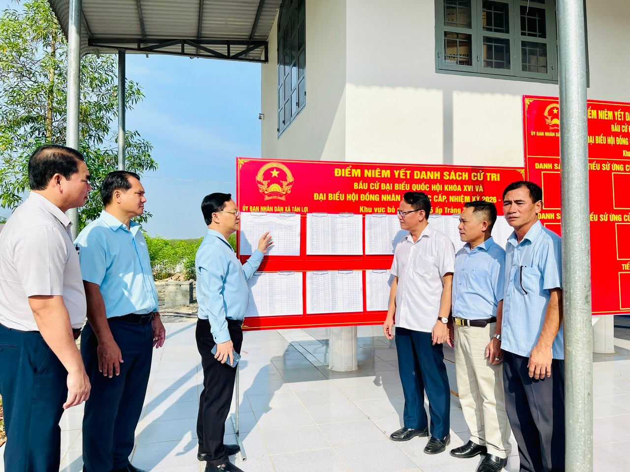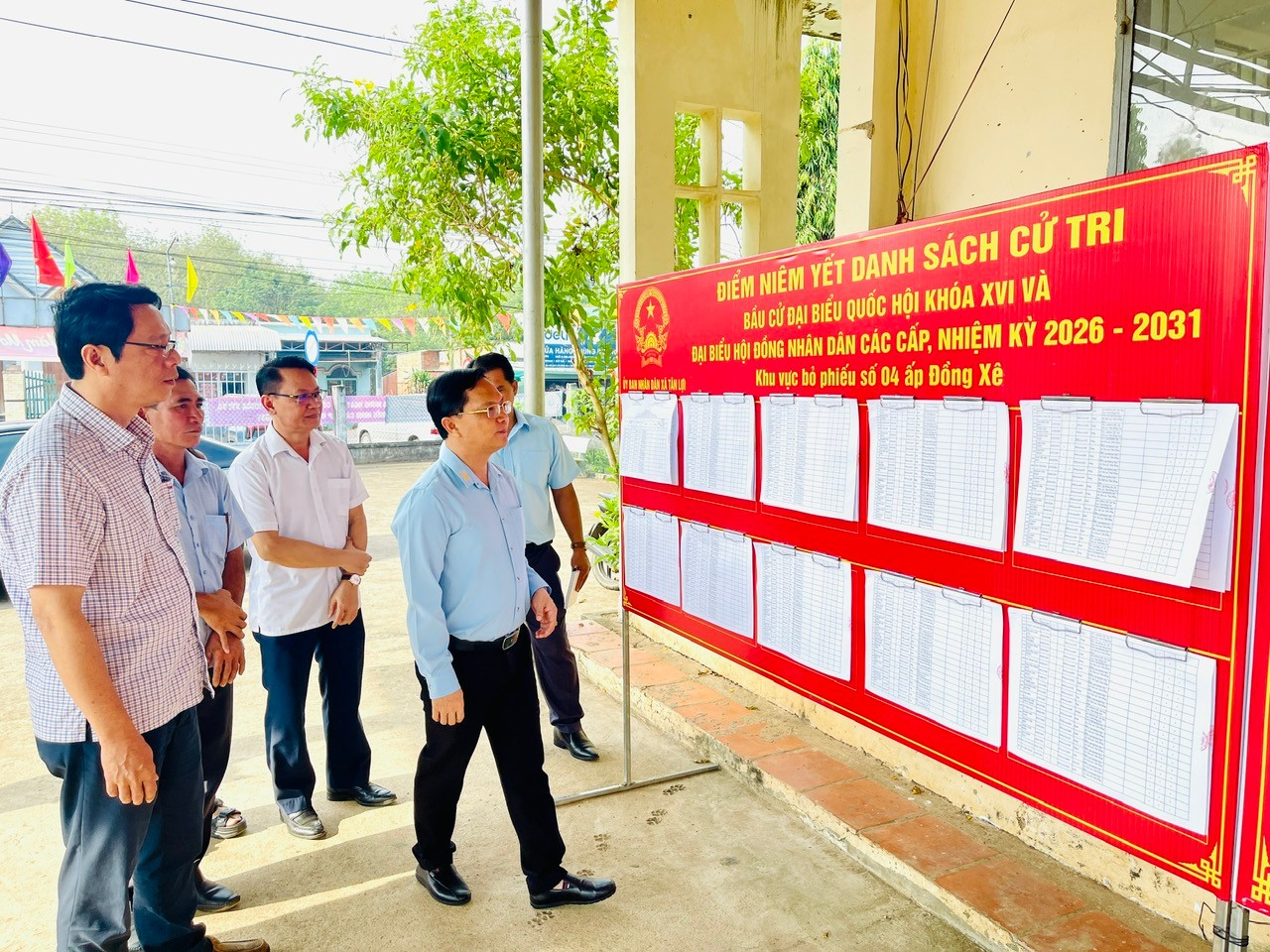 Đoàn kiểm tra đã trực tiếp khảo sát thực tế tại ấp Trảng Tranh, ấp Đồng Xê việc bố trí khu vực bỏ phiếu, niêm yết danh sách cử tri, danh sách người ứng cử, công tác trang trí, khánh tiết và các điều kiện đảm bảo phục vụ ngày bầu cử.