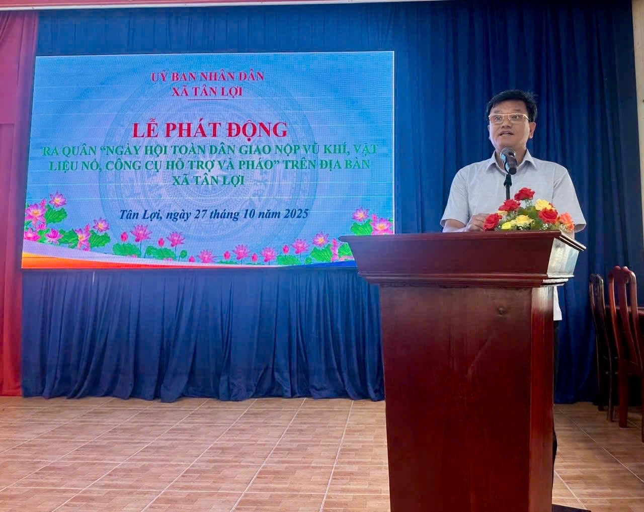 Phát biểu khai mạc buổi lễ, đồng chí Lê Văn Trân – Phó Bí thư Đảng ủy, Chủ tịch UBND xã Tân Lợi nhấn mạnh: “Công tác quản lý, vận động nhân dân giao nộp vũ khí, vật liệu nổ, công cụ hỗ trợ và pháo là nhiệm vụ quan trọng, góp phần giữ gìn an ninh trật tự, đảm bảo an toàn cho nhân dân. Mỗi người dân cần nâng cao ý thức, chủ động giao nộp, đồng thời tích cực tố giác các hành vi vi phạm pháp luật liên quan đến lĩnh vực này.”