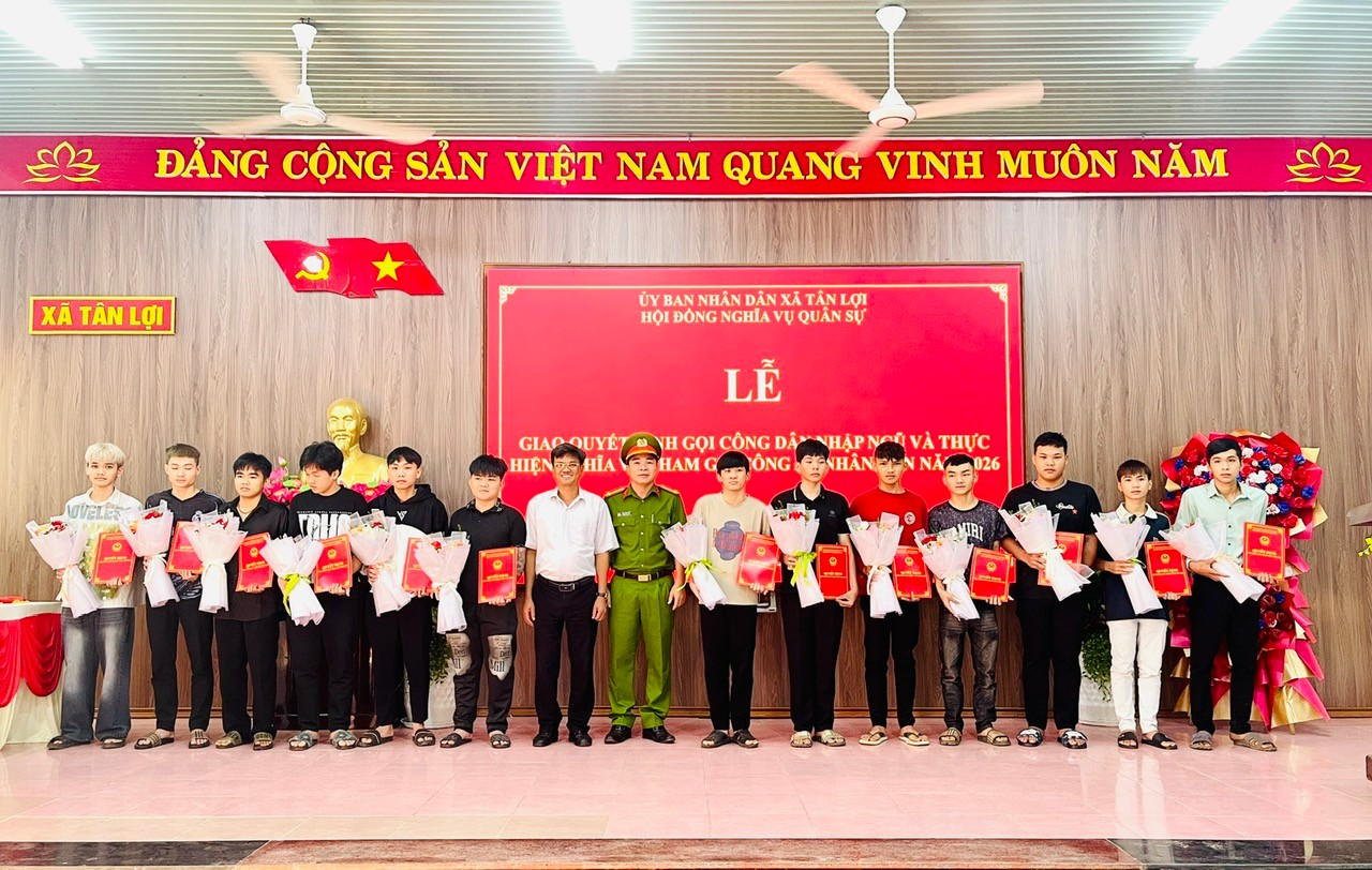 Sáng ngày 12/02/2026, tại Hội trường UBND xã Tân Lợi, Đảng ủy - HĐND - UBND - Hội đồng Nghĩa vụ quân sự xã đã long trọng tổ chức Lễ trao Quyết định gọi công dân nhập ngũ và thực hiện nghĩa vụ tham gia Công an nhân dân năm 2026.