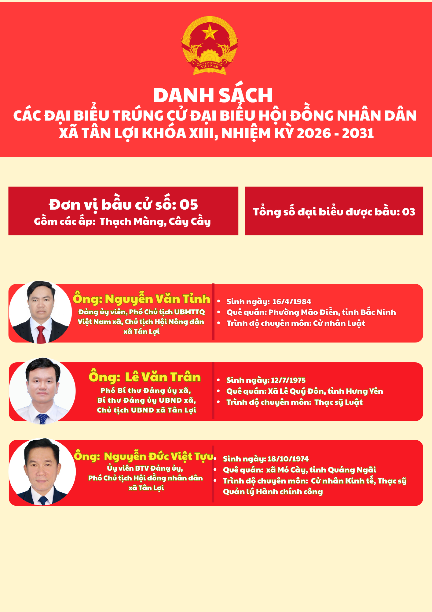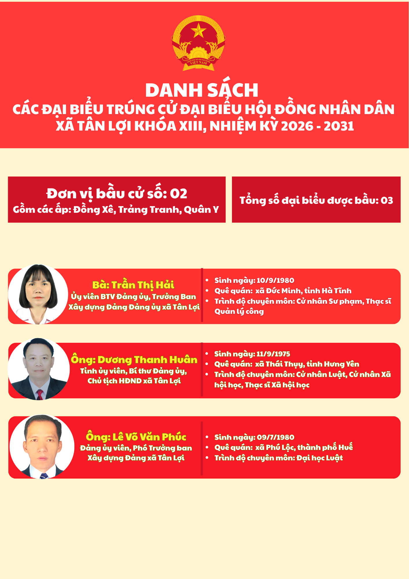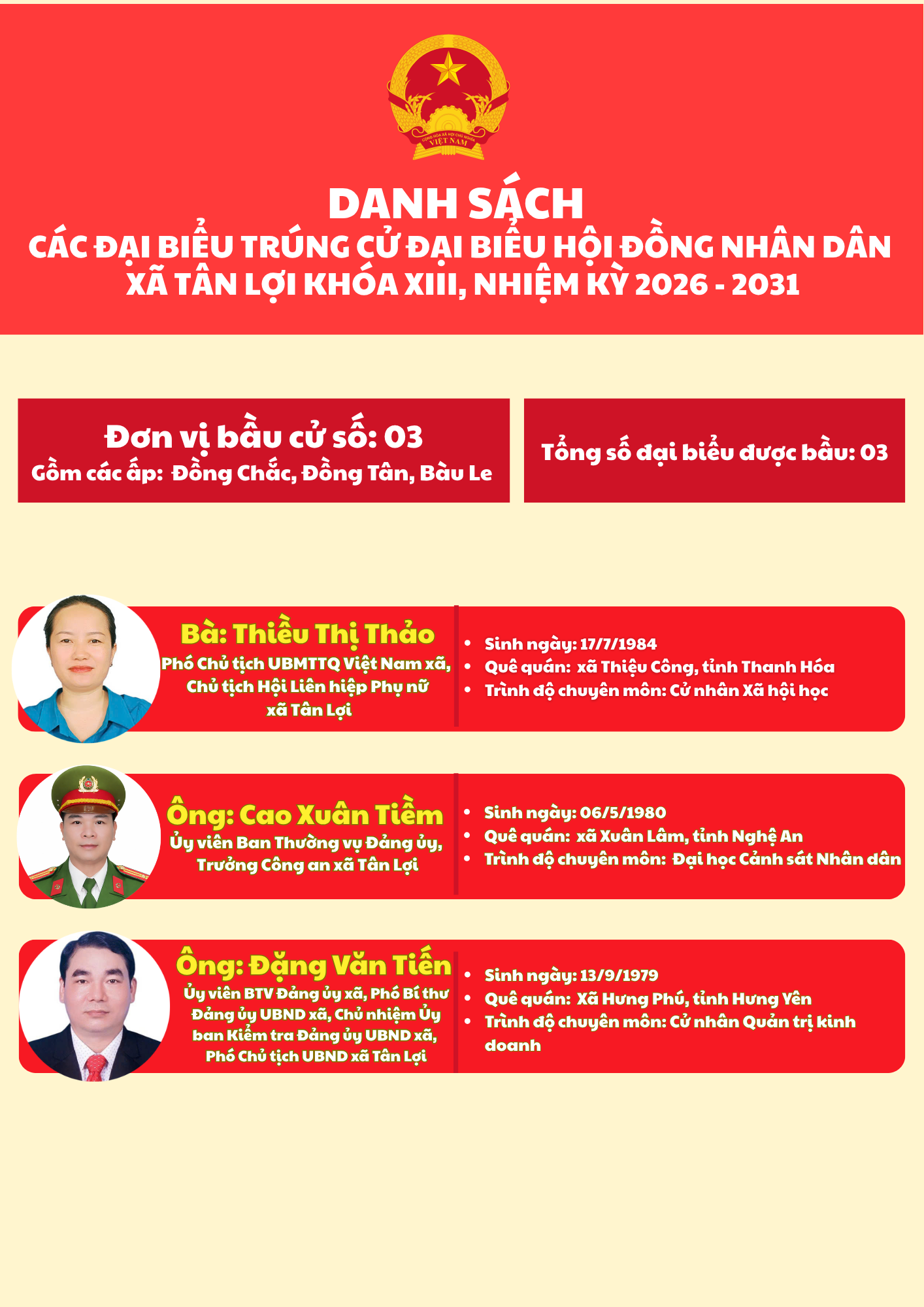 Trang thông tin điện tử xã Tân Lợi trân trọng giới thiệu danh sách 16 người trúng cử đại biểu HĐND xã Tân Lợi khóa XIII, nhiệm kỳ 2026-2031.<br />