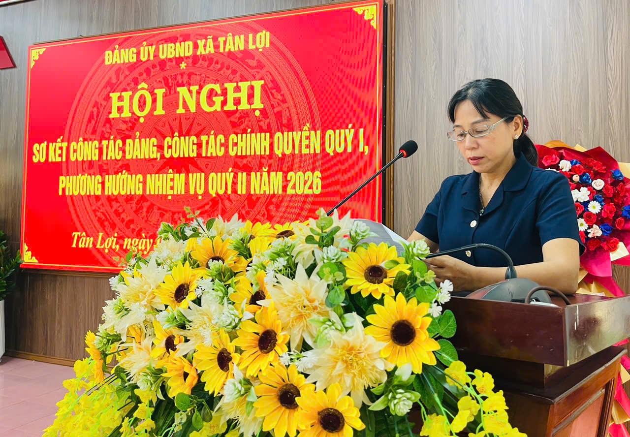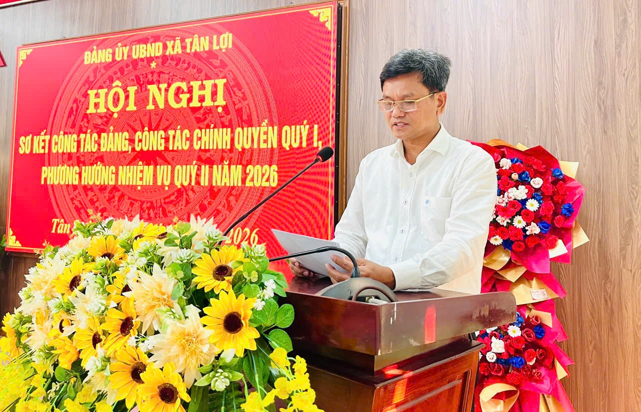 <p style="margin-left:2.85pt;text-align:justify;">Chiều ngày 07/4/2026, tại Hội trường UBND xã, Đảng ủy UBND xã Tân Lợi tổ chức Hội nghị sơ kết công tác Đảng, chính quyền quý I năm 2026 và triển khai phương hướng, nhiệm vụ trọng tâm quý II năm 2026.&nbsp;</p>