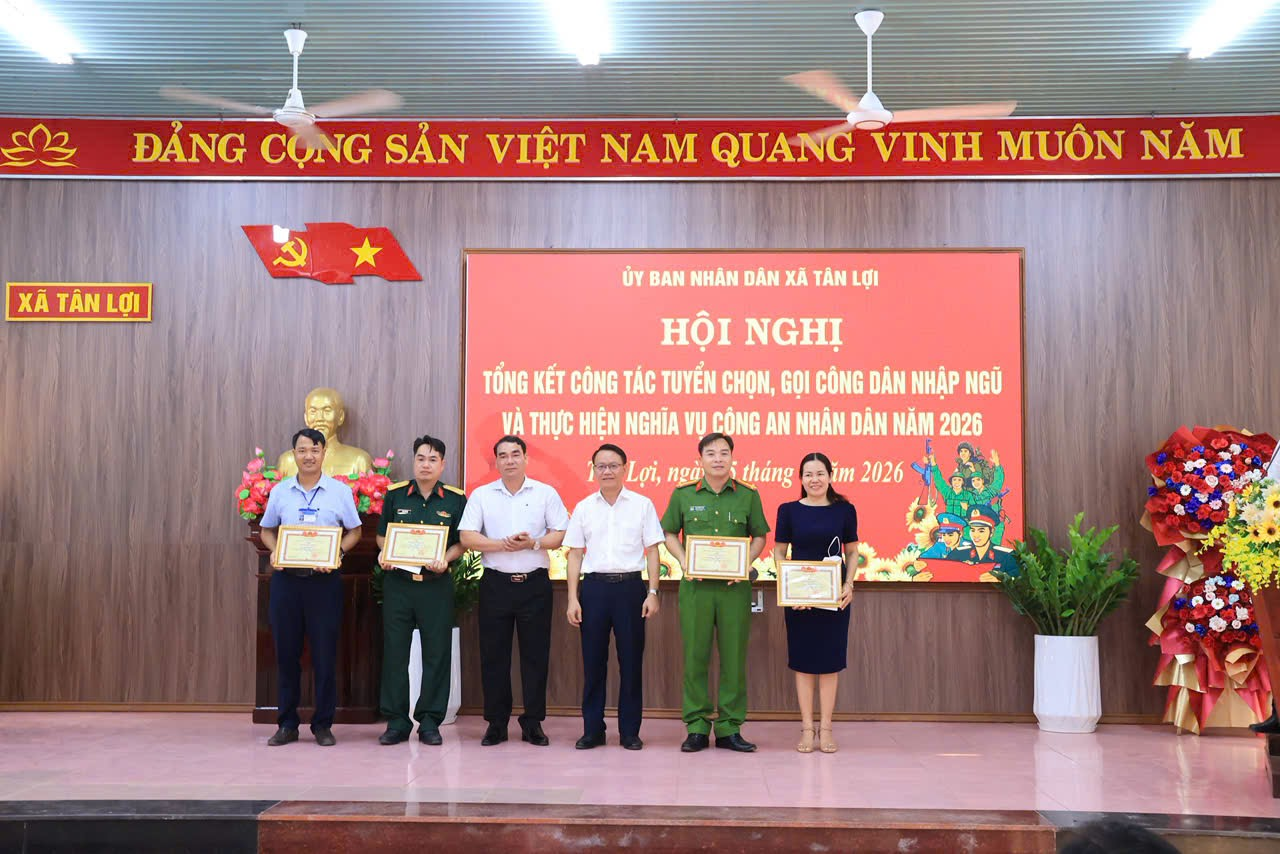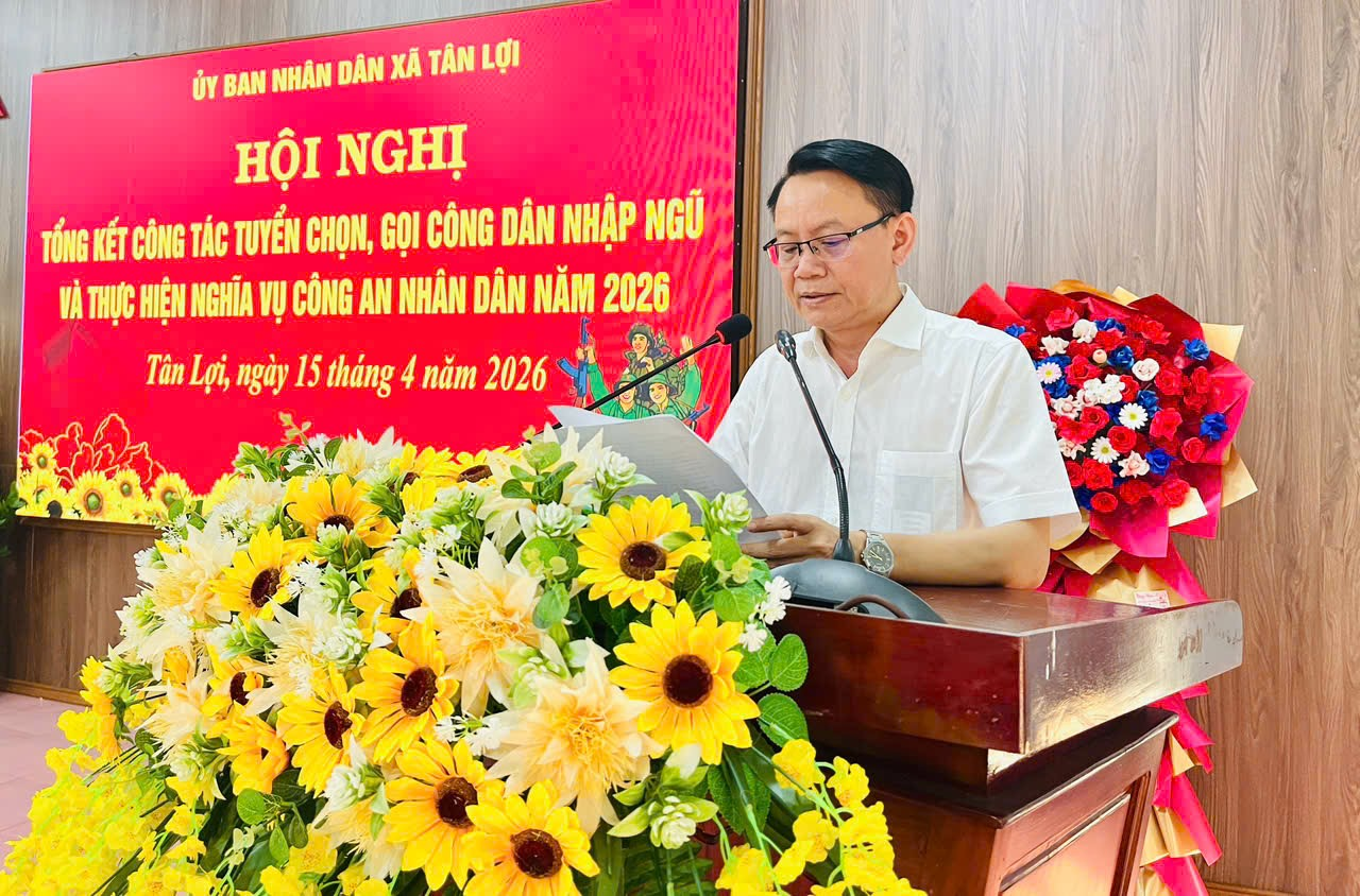 <p style="margin-left:2.85pt;text-align:justify;">Chiều ngày 15/4/2026, tại Hội trường A - UBND xã Tân Lợi (ấp Trảng Tranh), Ủy ban nhân dân xã Tân Lợi đã tổ chức Hội nghị tổng kết công tác tuyển chọn, gọi công dân nhập ngũ và thực hiện nghĩa vụ tham gia Công an nhân dân năm 2026.</p>