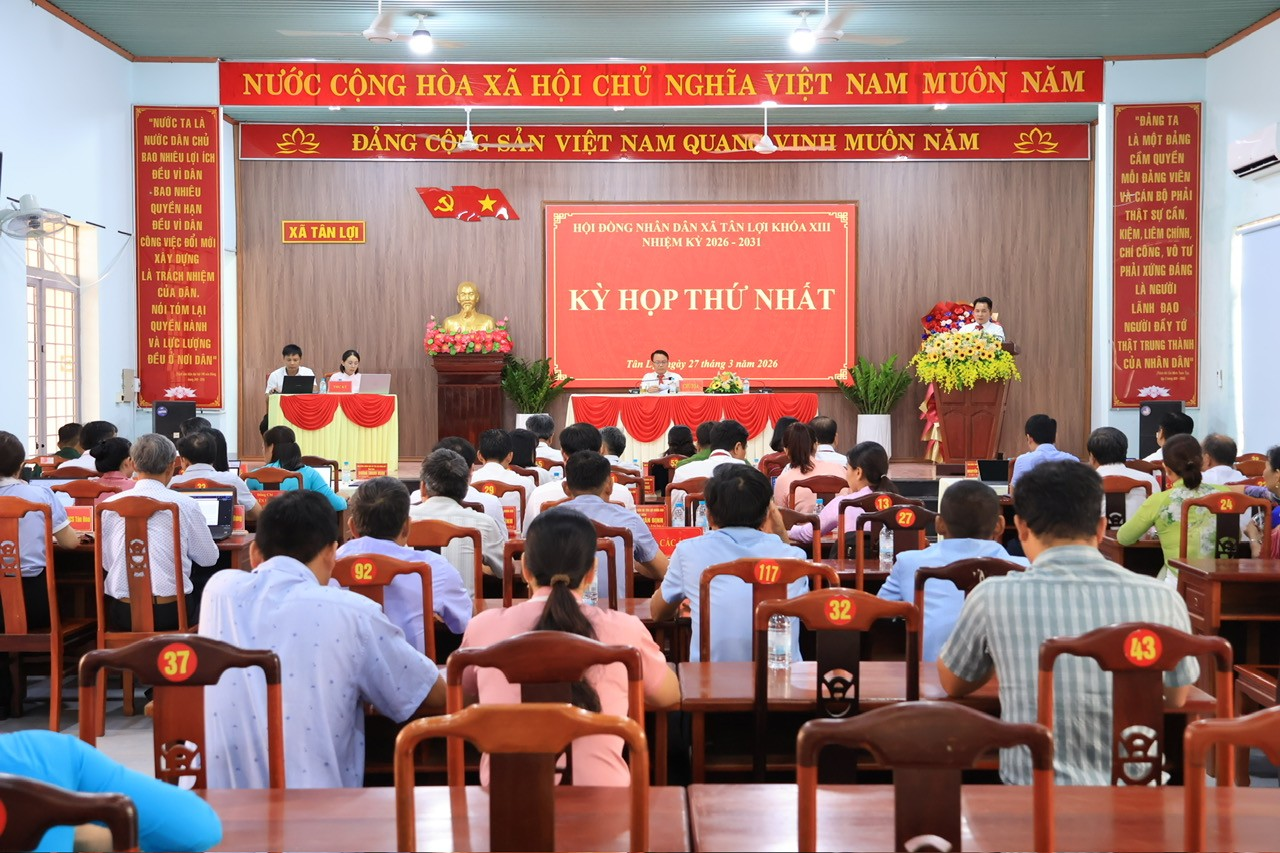 <p style="margin-left:2.85pt;text-align:justify;">Chiều ngày 27 tháng 3 năm 2026, tại Hội trường A. Hội đồng nhân dân xã Tân Lợi đã long trọng tổ chức Kỳ họp thứ Nhất HĐND xã khóa XIII, nhiệm kỳ 2026 - 2031. Đây là kỳ họp có ý nghĩa đặc biệt quan trọng, đánh dấu bước khởi đầu cho nhiệm kỳ mới của chính quyền địa phương.</p>