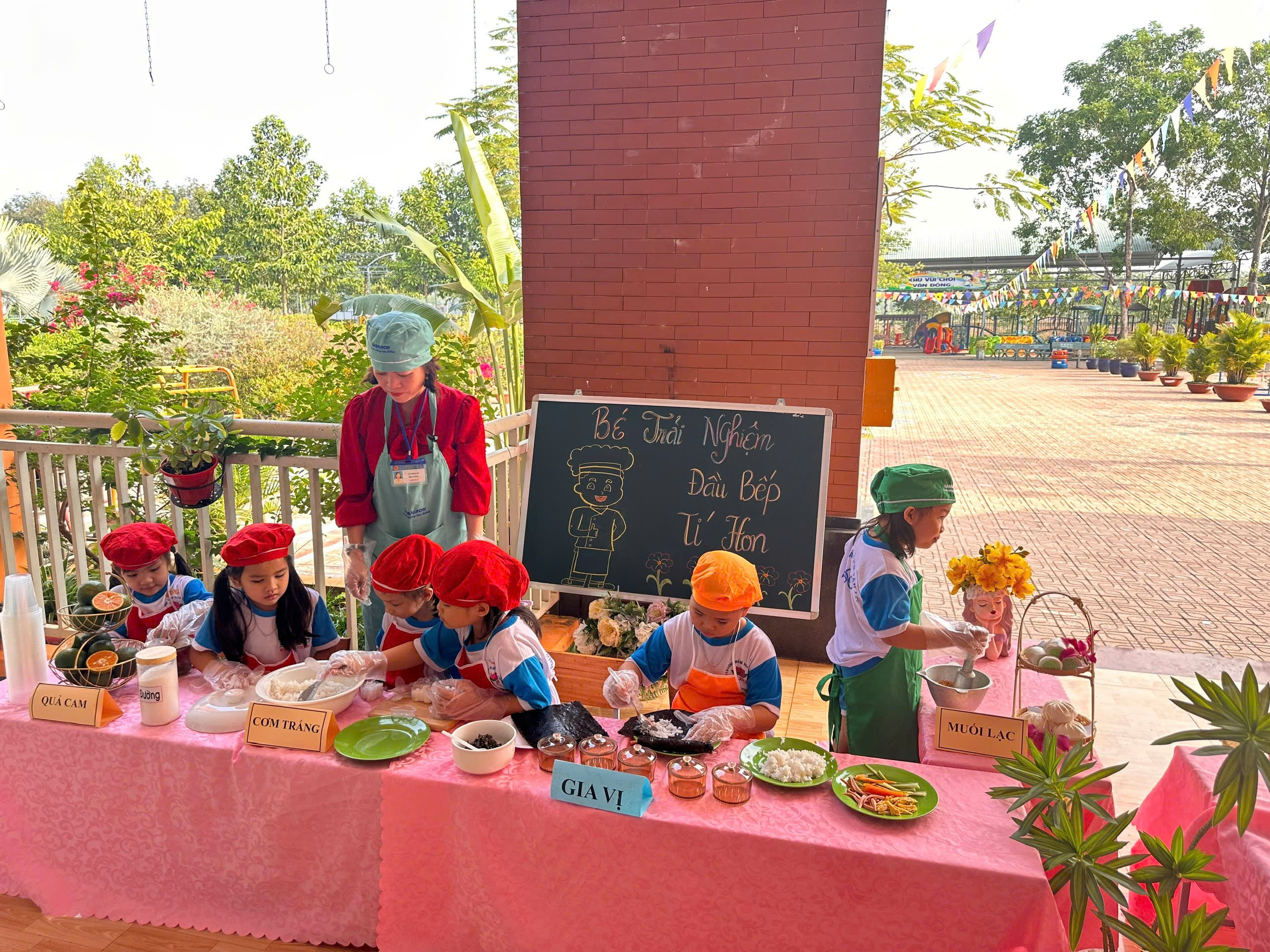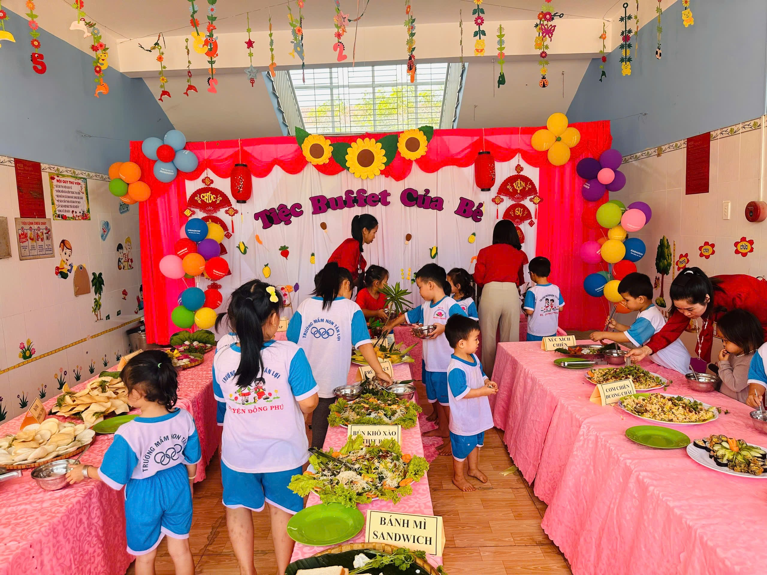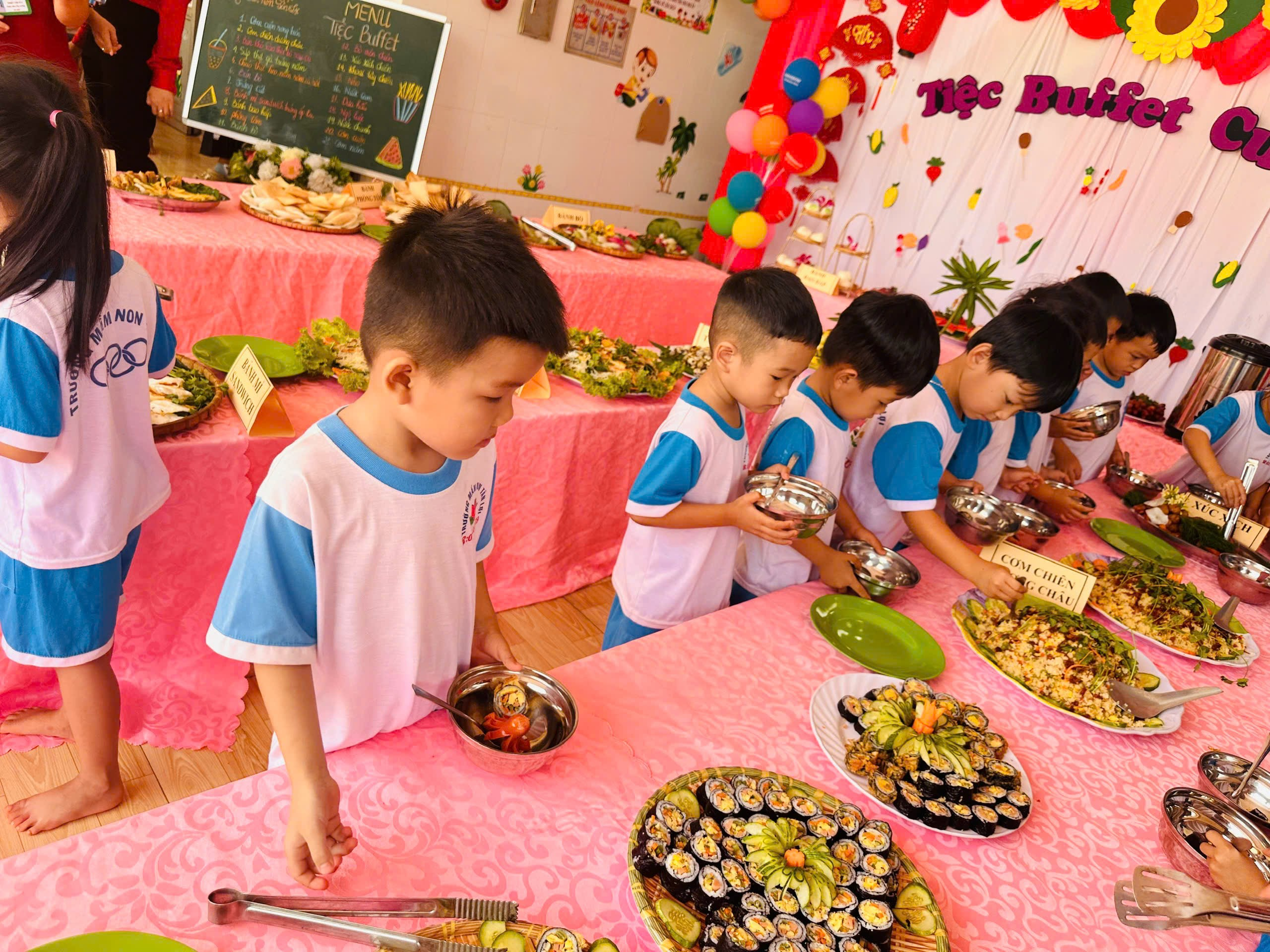 Trong không gian được trang trí sinh động, hấp dẫn, các cháu được tham gia vào nhiều hoạt động bổ ích như: xếp hàng lấy thức ăn, lựa chọn món ăn theo sở thích, biết mời cô và bạn, giữ gìn vệ sinh khi ăn uống và tự giác dọn dẹp sau khi dùng bữa. Thực đơn buffet được nhà trường chuẩn bị phong phú, đảm bảo đầy đủ dinh dưỡng và an toàn vệ sinh thực phẩm, phù hợp với lứa tuổi mầm non. Đồng thời còn có góc trãi nghiệm “ Đầu bếp tí hon” tại góc này các cháu được hóa thân vào các đầu bếp tí hon tạo ra nhiều món ăn để phục vụ cho các bạn.