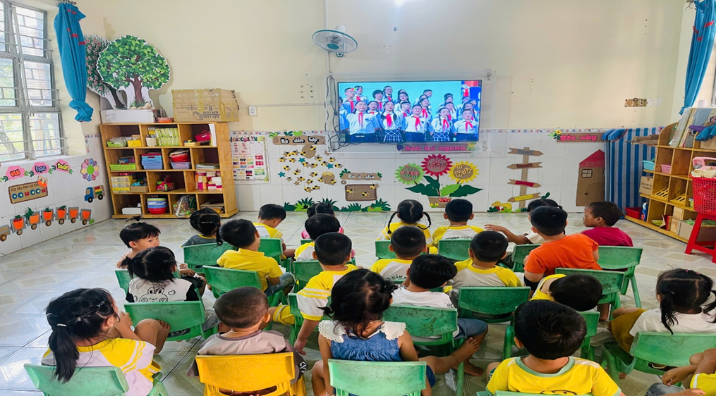 Các bé Trường Mầm non Tân Hòa theo dõi Lễ Khai giảng trực tuyến tại lớp học
