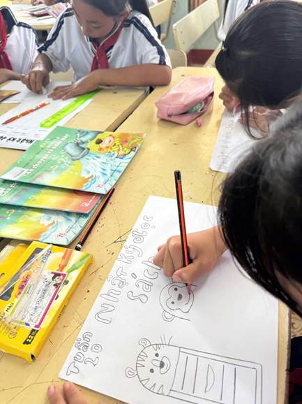 Trong tiết học, giáo viên đóng vai trò là người hướng dẫn, khơi gợi niềm hứng thú đọc sách thông qua các hoạt động như: giới thiệu sách ngắn gọn, đặt câu hỏi mở, khuyến khích học sinh chia sẻ nội dung câu chuyện, nhân vật yêu thích và những bài học rút ra sau khi đọc. Nhiều học sinh mạnh dạn trình bày cảm nhận trước lớp, thể hiện sự tự tin, khả năng giao tiếp và tư duy ngôn ngữ ngày càng tiến bộ.
