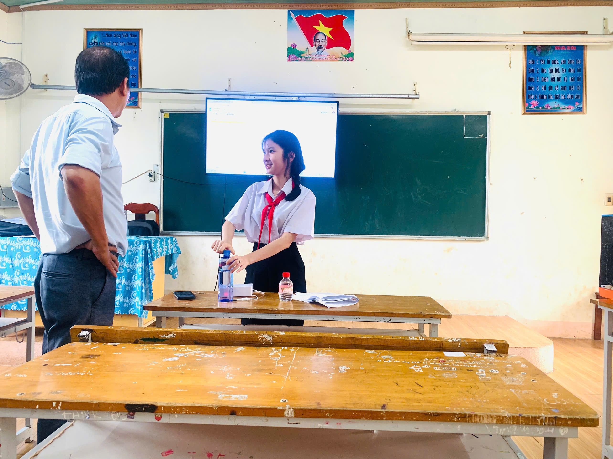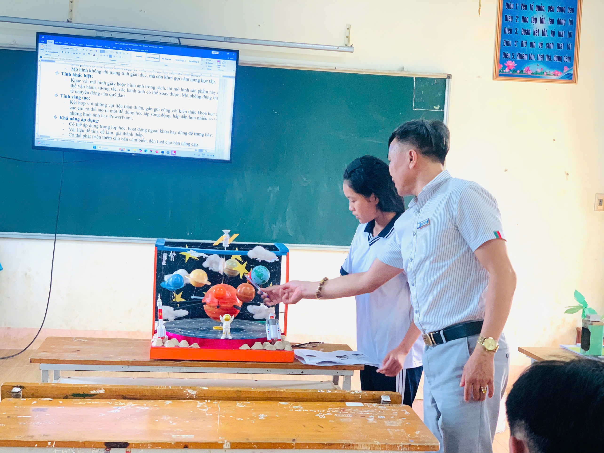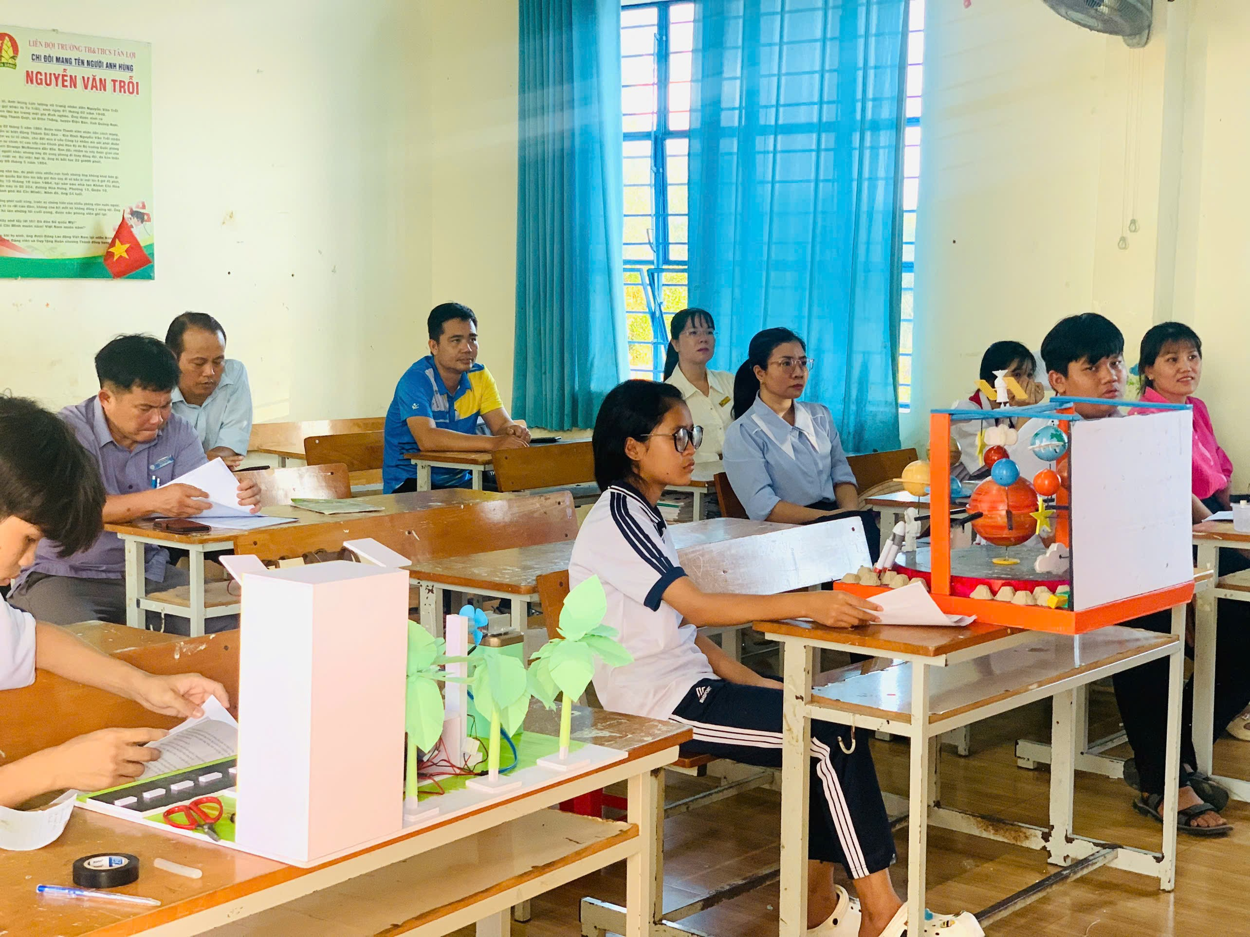 Bên cạnh đó, nhà trường đã chuẩn bị đầy đủ cơ sở vật chất như phòng học, thiết bị trình chiếu, khu vực trưng bày sản phẩm, tạo điều kiện thuận lợi để học sinh trình bày, giới thiệu và bảo vệ các đề tài nghiên cứu.