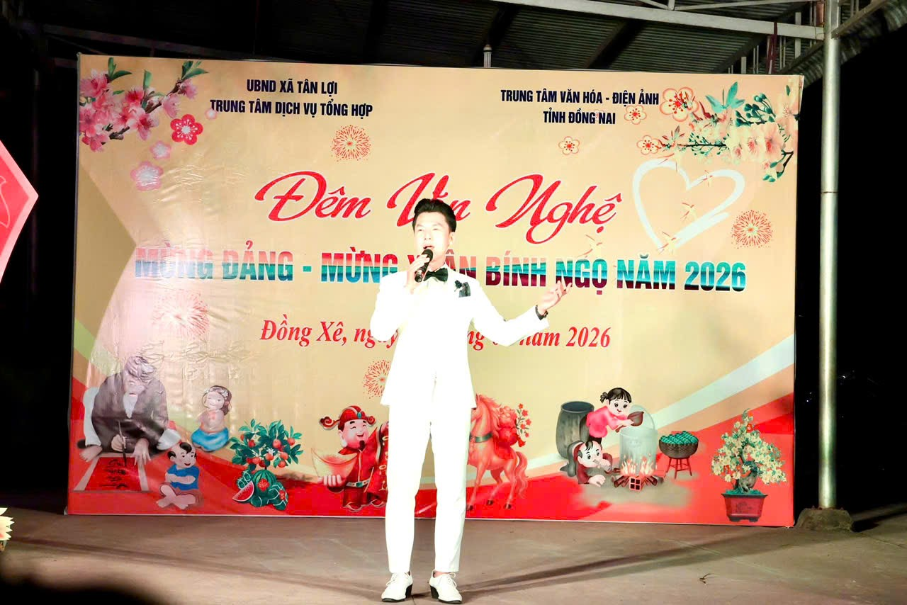 Hòa trong không khí vui tươi, phấn khởi chào mừng thành công Đại hội đại biểu toàn quốc lần thứ XIV của Đảng và đón chào Xuân mới Bính Ngọ năm 2026, tối ngày 23/01/2026, tại Nhà Văn hóa ấp Đồng Xê, xã Tân Lợi đã diễn ra chương trình văn nghệ phục vụ Nhân dân trên địa bàn. Chương trình do Trung tâm Dịch vụ tổng hợp xã Tân Lợi chủ trì, phối hợp với Trung tâm Văn hóa - Điện ảnh tỉnh Đồng Nai và Ban Quản lý ấp Đồng Xê tổ chức.