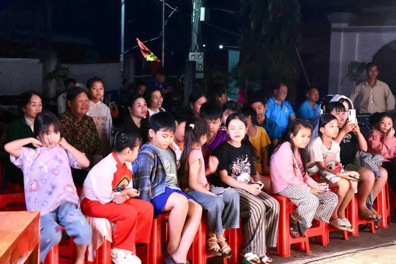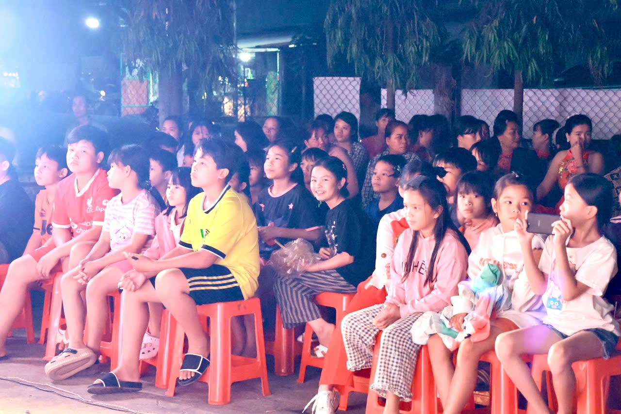 Hình ảnh các em thiếu nhi và bà con nhân dân đến xem và cổ vũ cho đêm văn nghệ