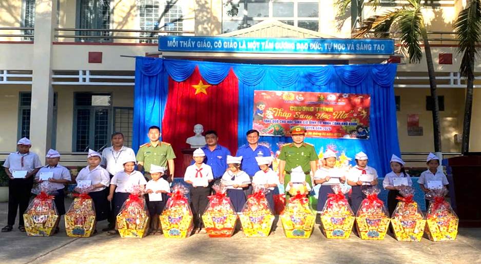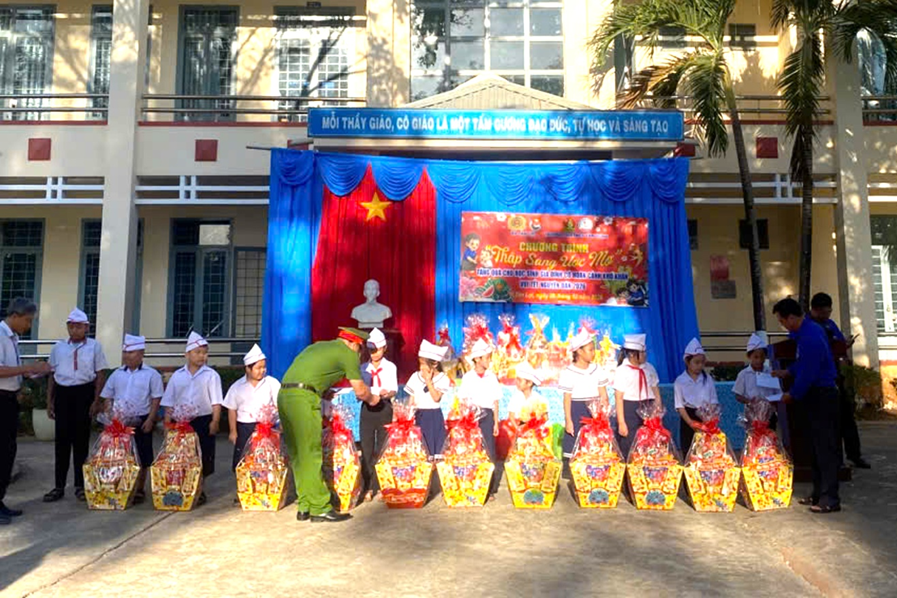 Tại chương trình, đại diện Công an xã, Đoàn Thanh niên xã và Ban Giám hiệu nhà trường đã trao tặng nhiều phần quà ý nghĩa cho các em học sinh có hoàn cảnh khó khăn. Đây là hoạt động thiết thực, thể hiện tinh thần tương thân tương ái, góp phần giáo dục các em học sinh về lòng nhân ái, sự sẻ chia và trách nhiệm với cộng đồng.