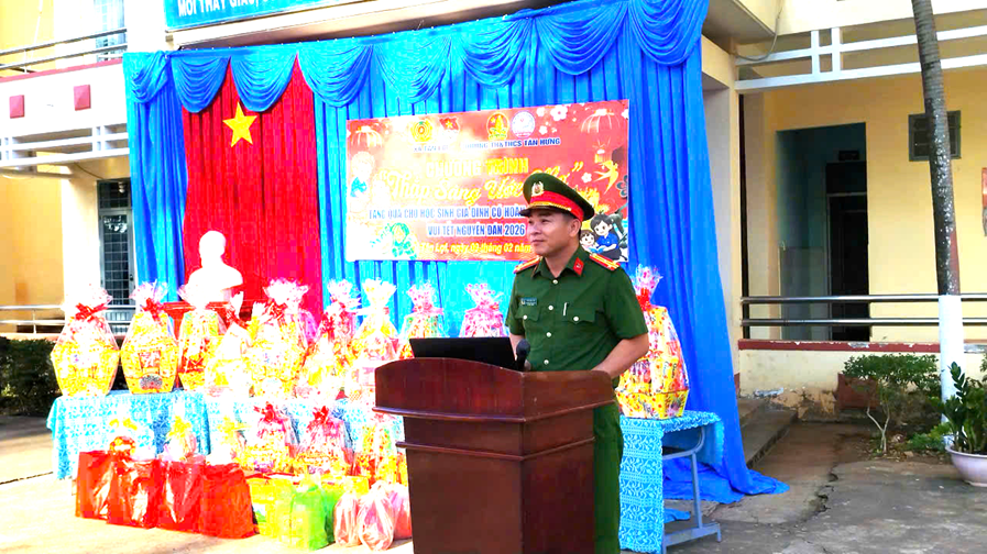 Tham dự chương trình có Thượng tá Cao Xuân Tiềm – Trưởng Công an xã Tân Lợi; đồng chí Nguyễn Văn Định – Đảng ủy viên, Phó Chủ tịch Ủy ban MTTQ Việt Nam xã, Bí thư Đoàn xã Tân Lợi; thầy Lê Văn Lực – Phó Hiệu trưởng Trường TH&THCS Tân Hưng cùng toàn thể cán bộ, giáo viên và hơn 300 em học sinh nhà trường.